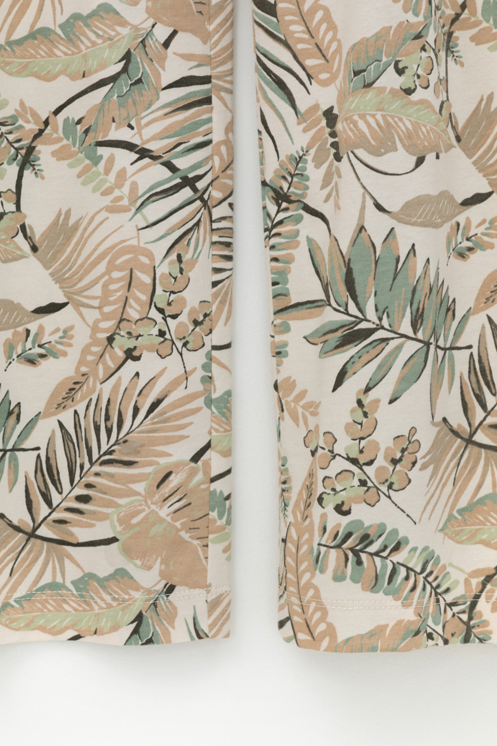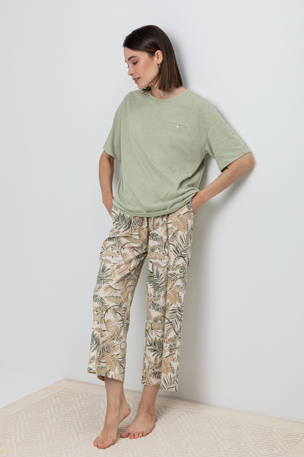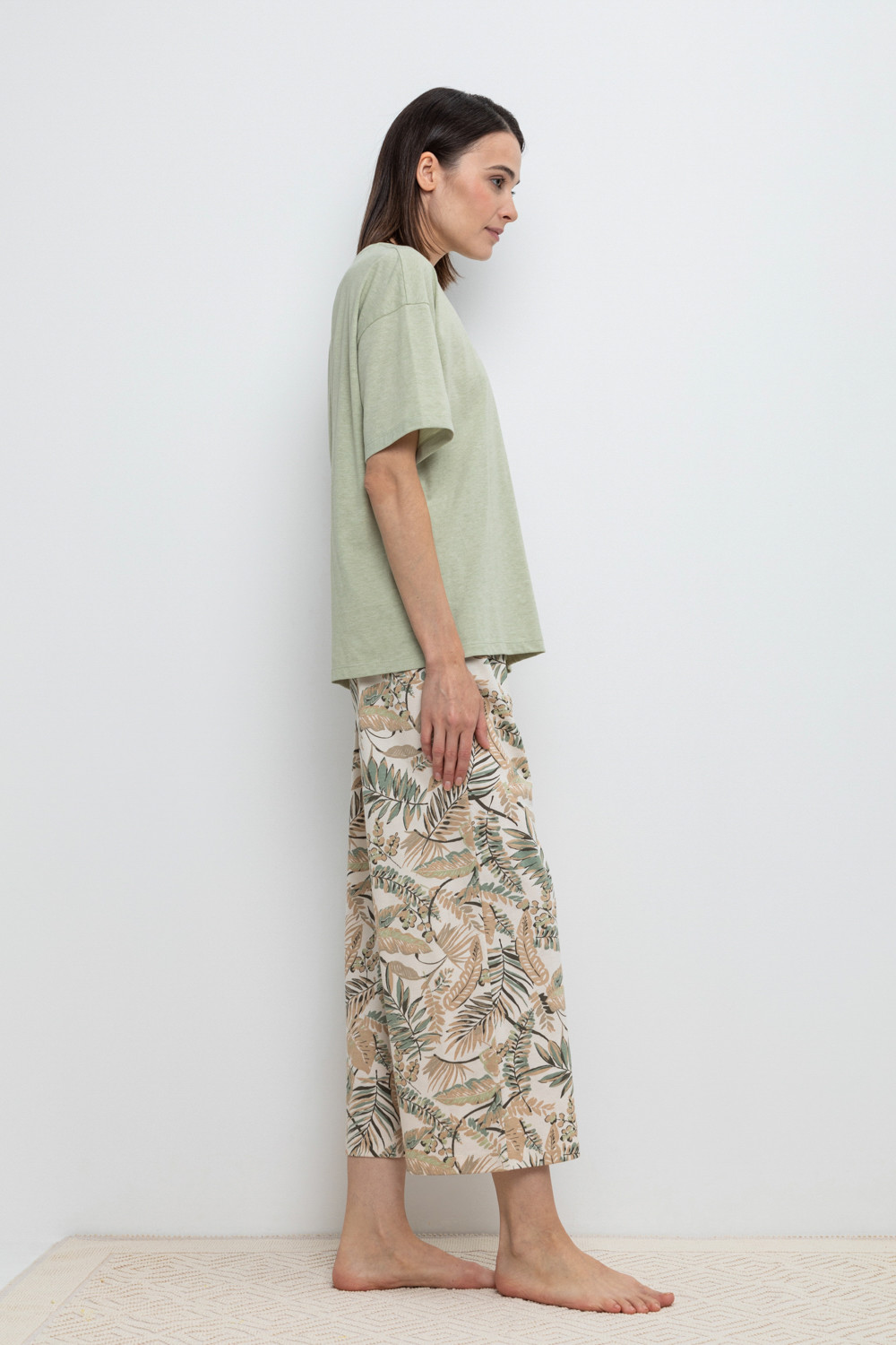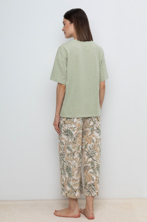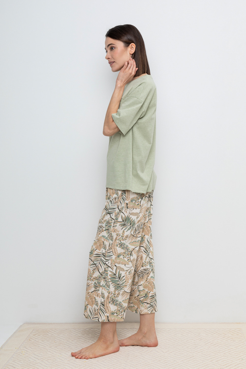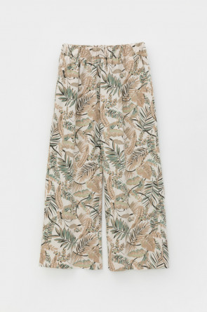 Лёгкие комфортные брюки из набивного трикотажа супрем. Модель с поясом на резинке и боковыми карманами. Низ изделия обработан плоскими швами. Гладкий материал приятен к телу, не теряет форму и позволяет коже дышать.