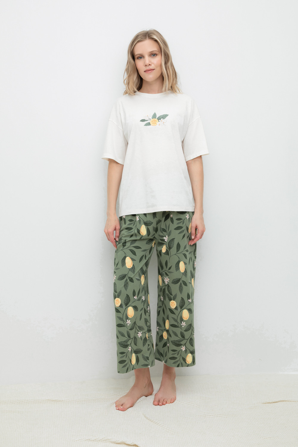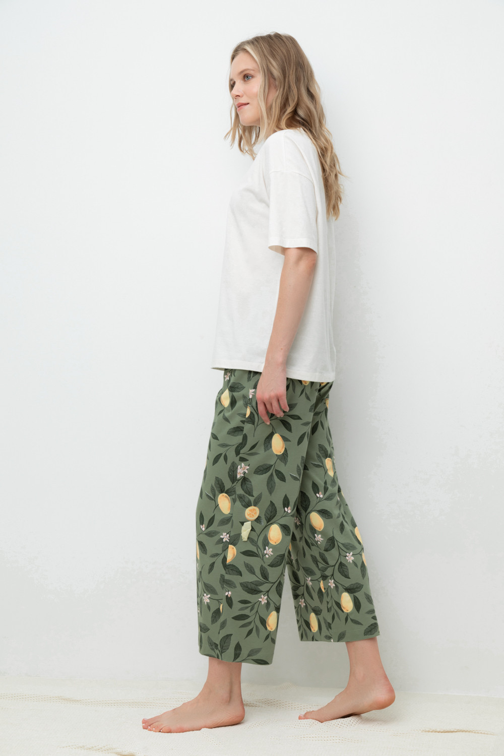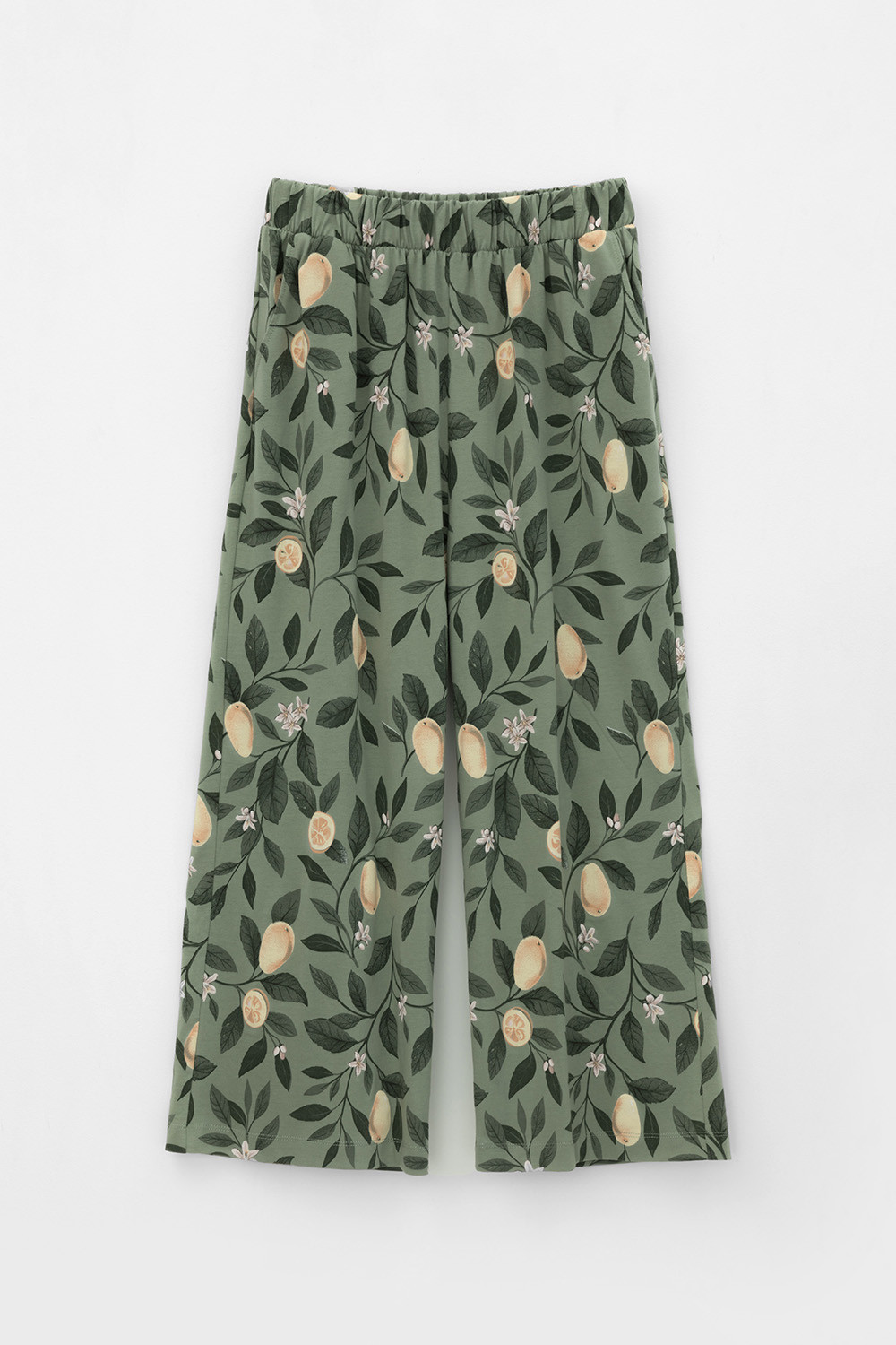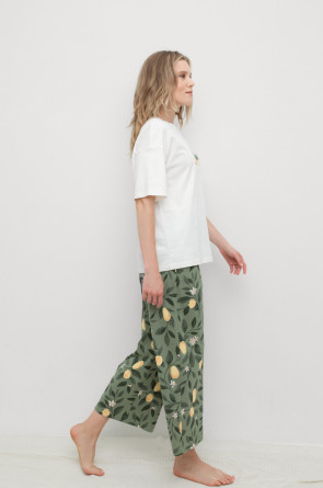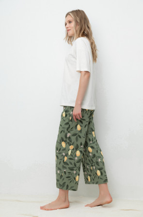 Лёгкие комфортные брюки из набивного трикотажа супрем. Модель с поясом на резинке и боковыми карманами. Низ изделия обработан плоскими швами. Гладкий материал приятен к телу, не теряет форму и позволяет коже дышать.