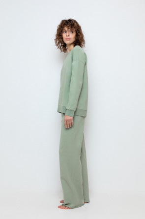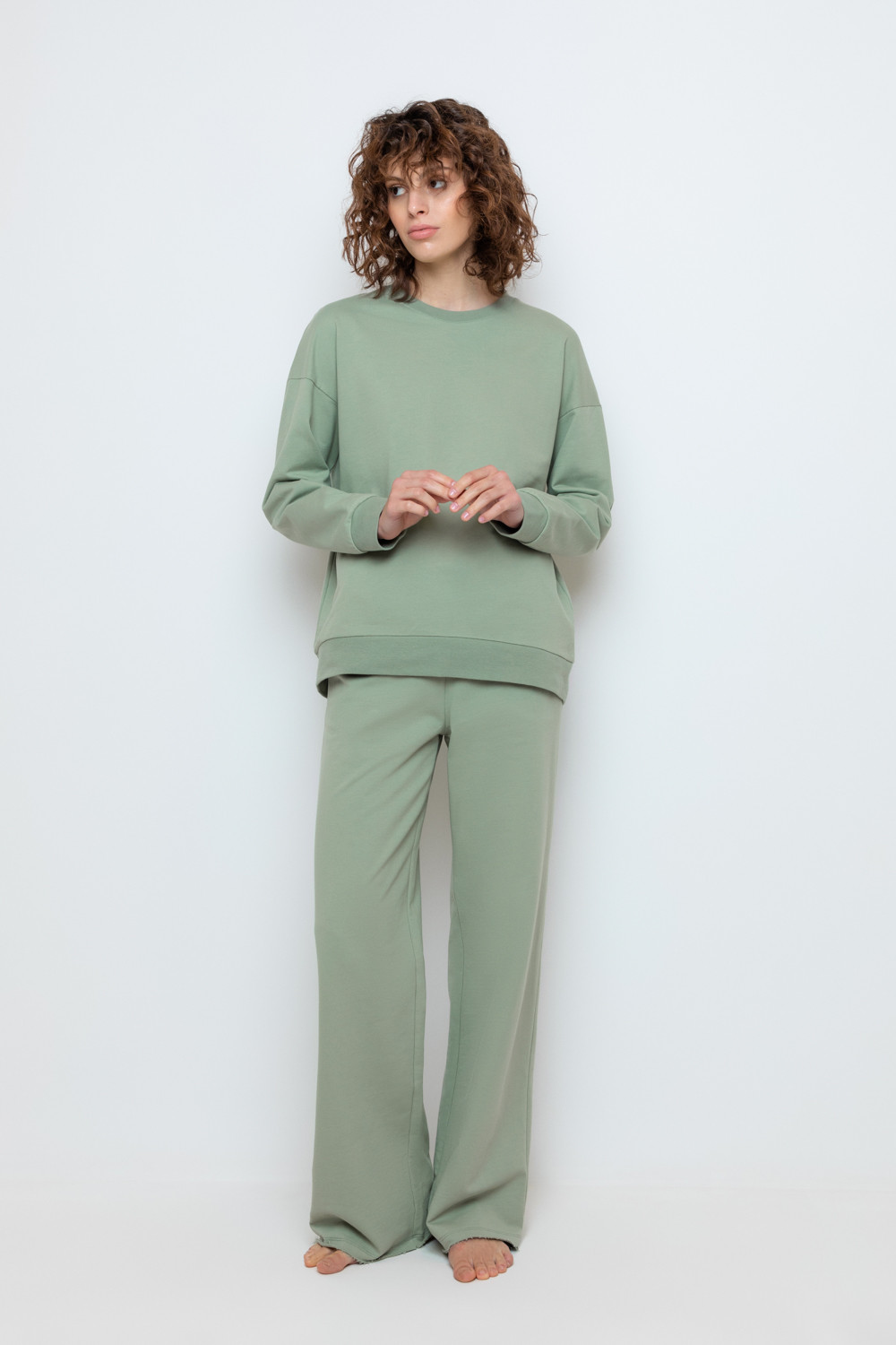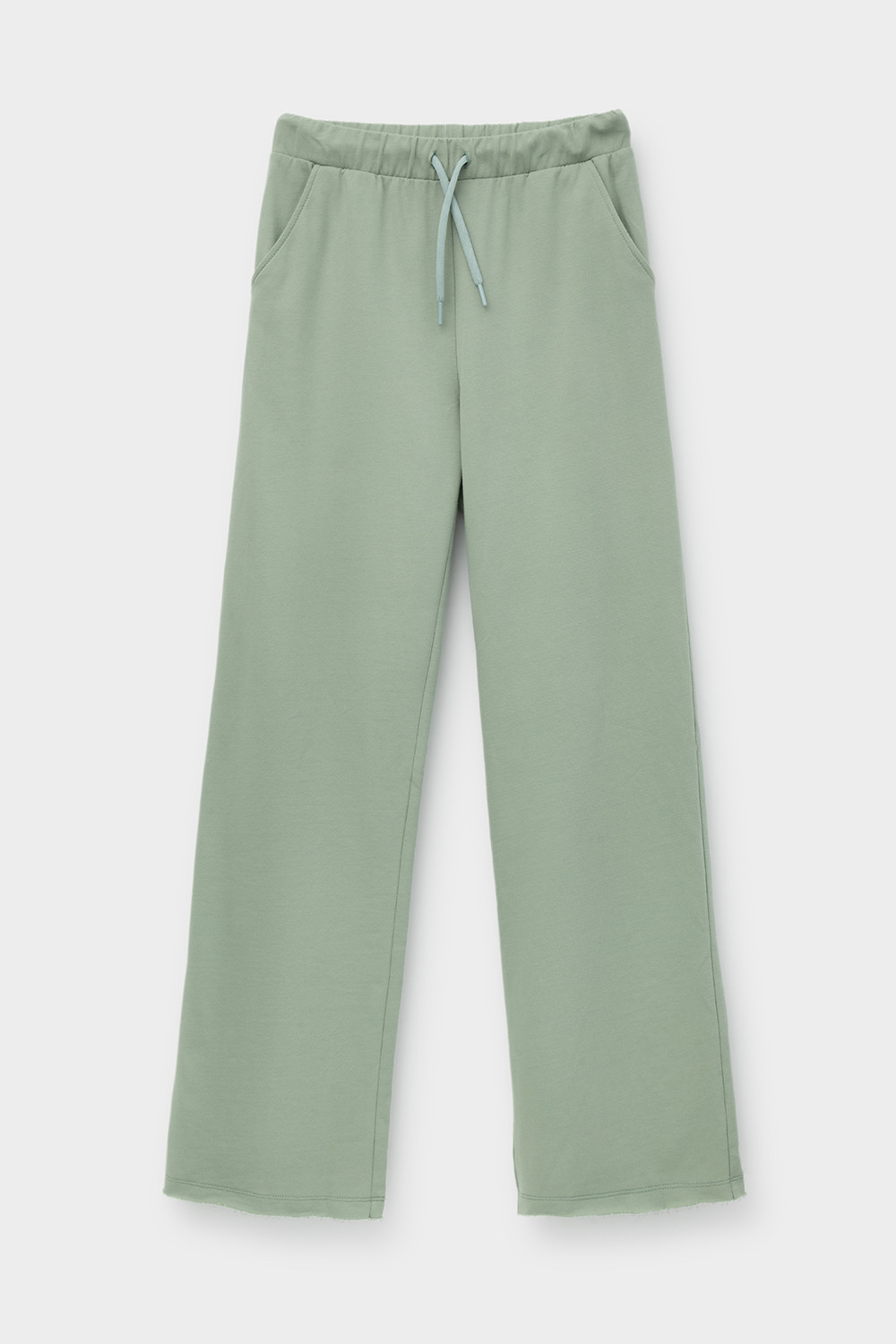 Комфортные широкие брюки на резинке из однотонного футера петли. Регулируются по ширине с помощью шнурка. По бокам удобные карманы. Низ обработан плоскими швами с открытым срезом. Все трикотажные полотна производятся в соответствии с нормами сертификата ЭкоТекс. Сделано в России