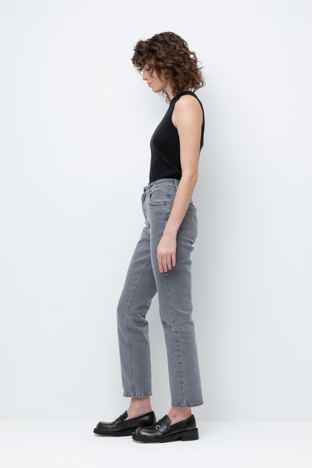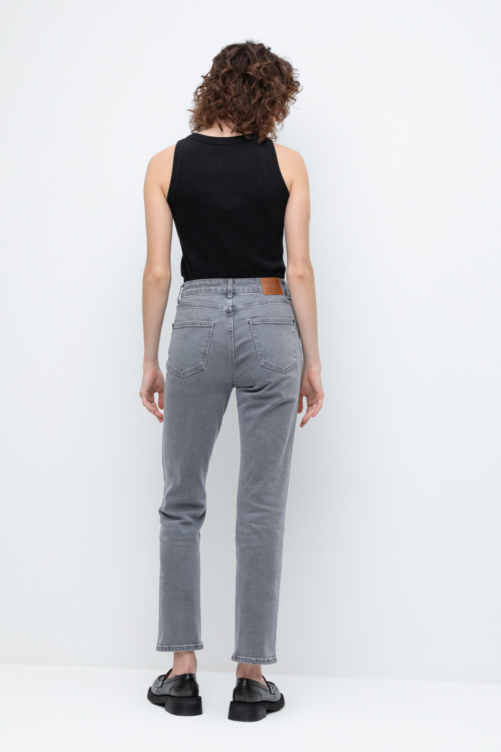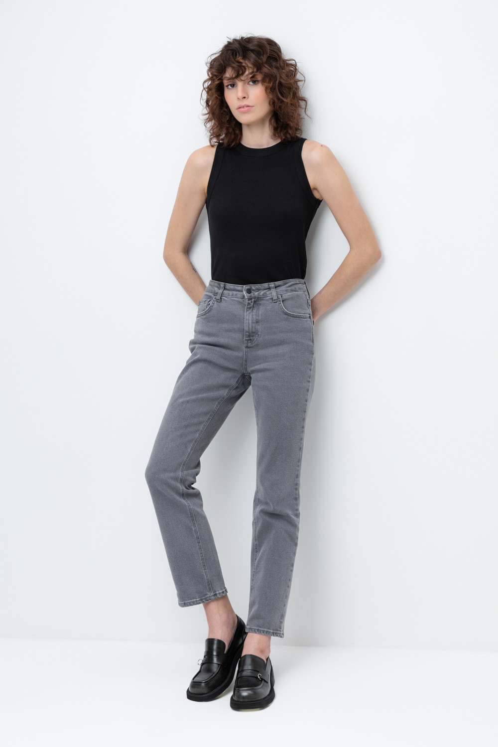 Женские джинсы из мягкого стрейч денима прямого кроя с завышенной линией талии. Модель с классическими 5 карманами и фирменной нашивкой из эко кожи Very Neat