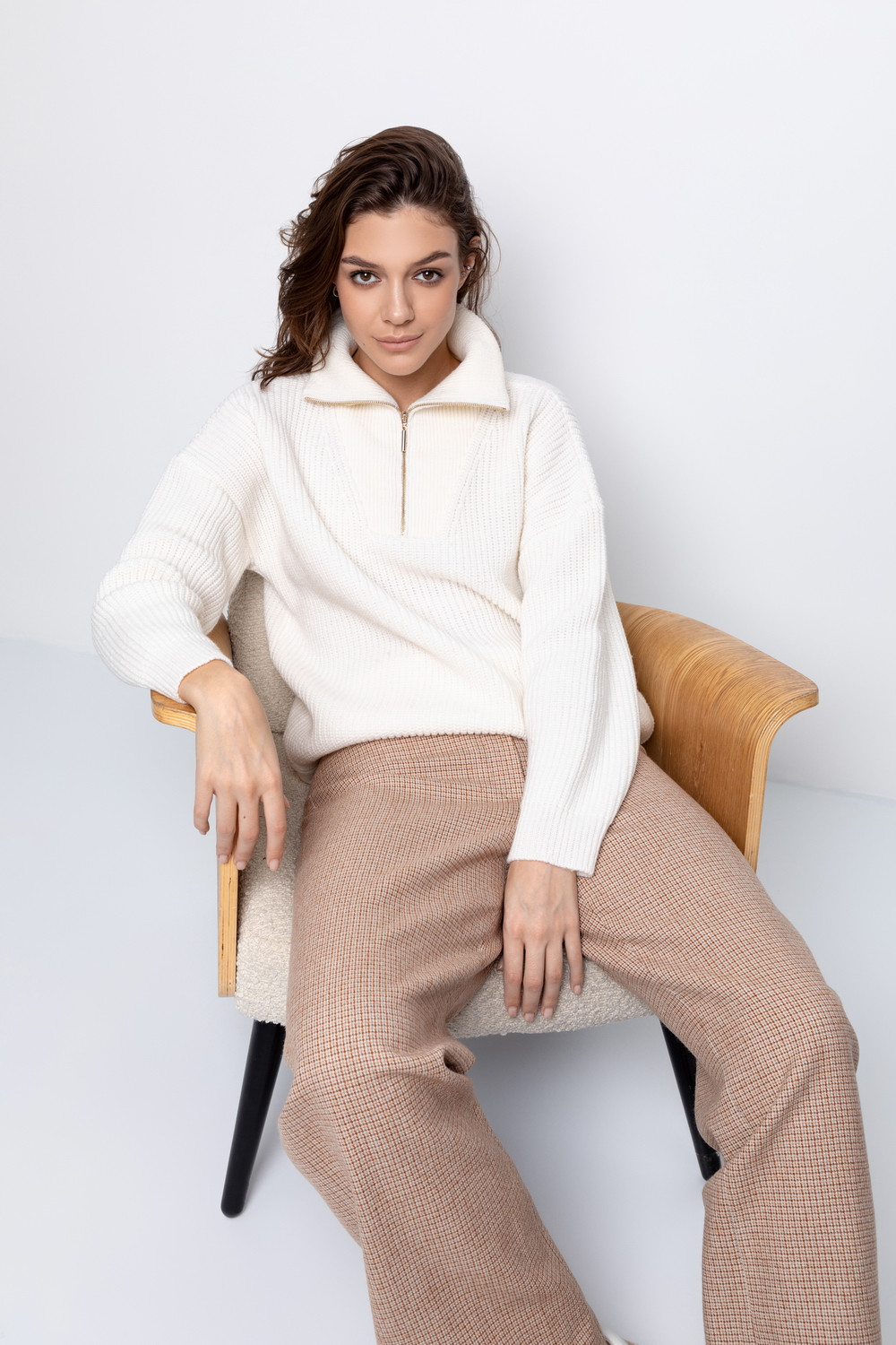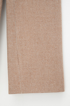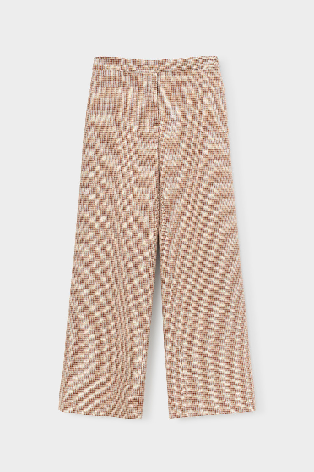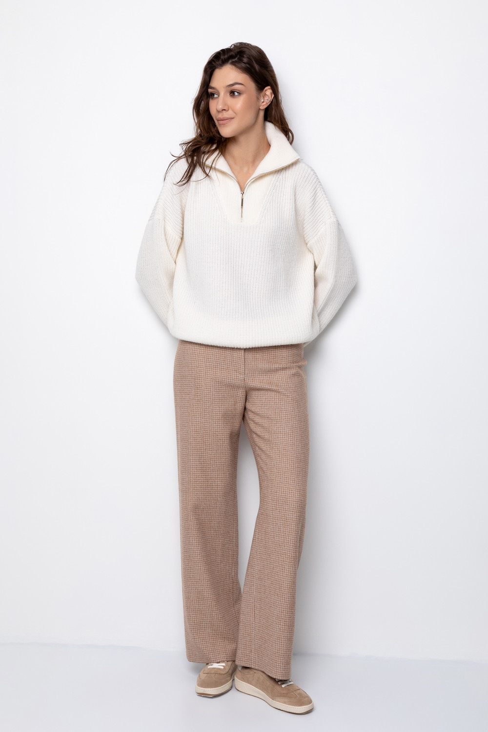 Широкие брюки из шерсти в мелкую клетку с завышенной линией талии. Застегивается спереди на молнию и брючный крючок.