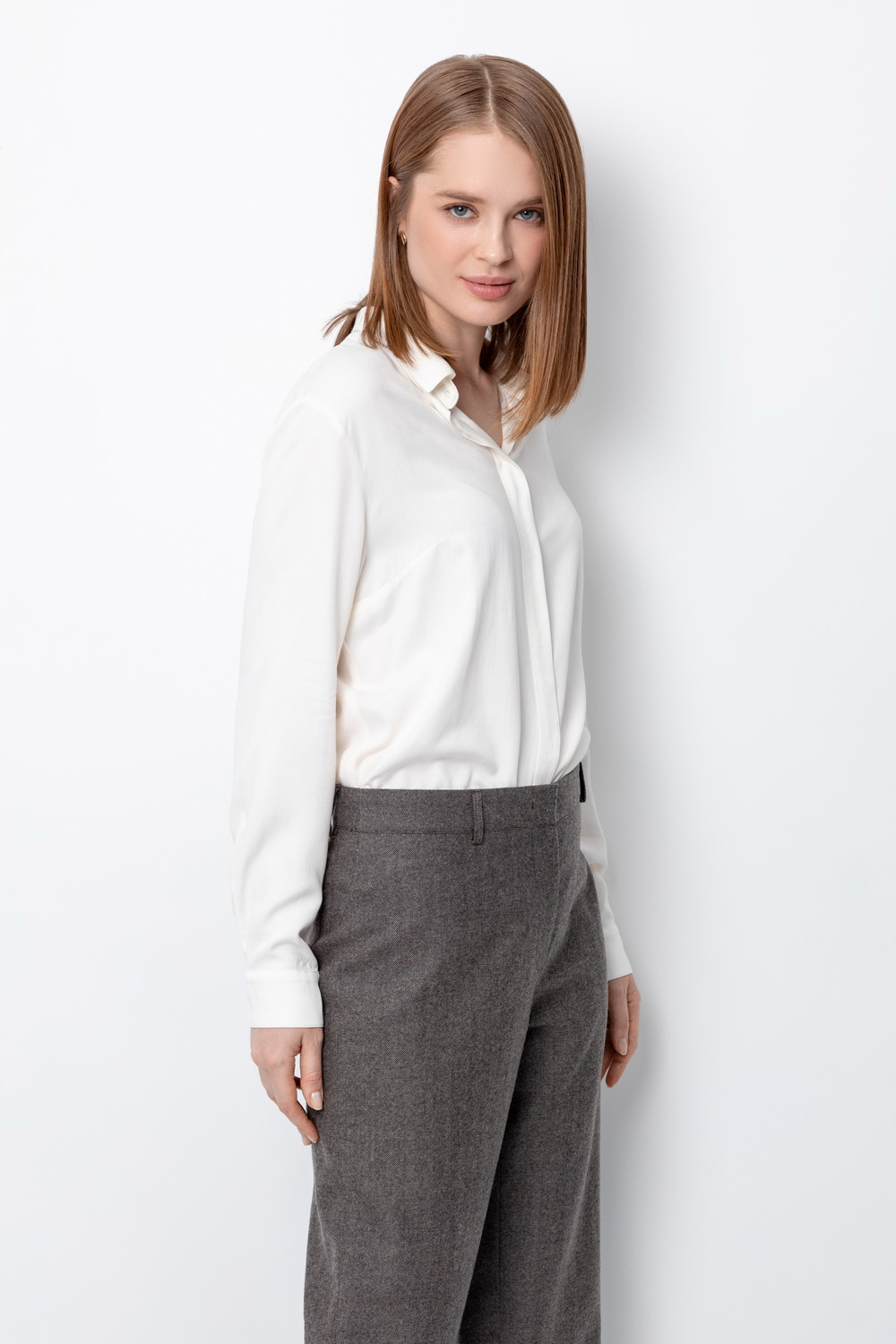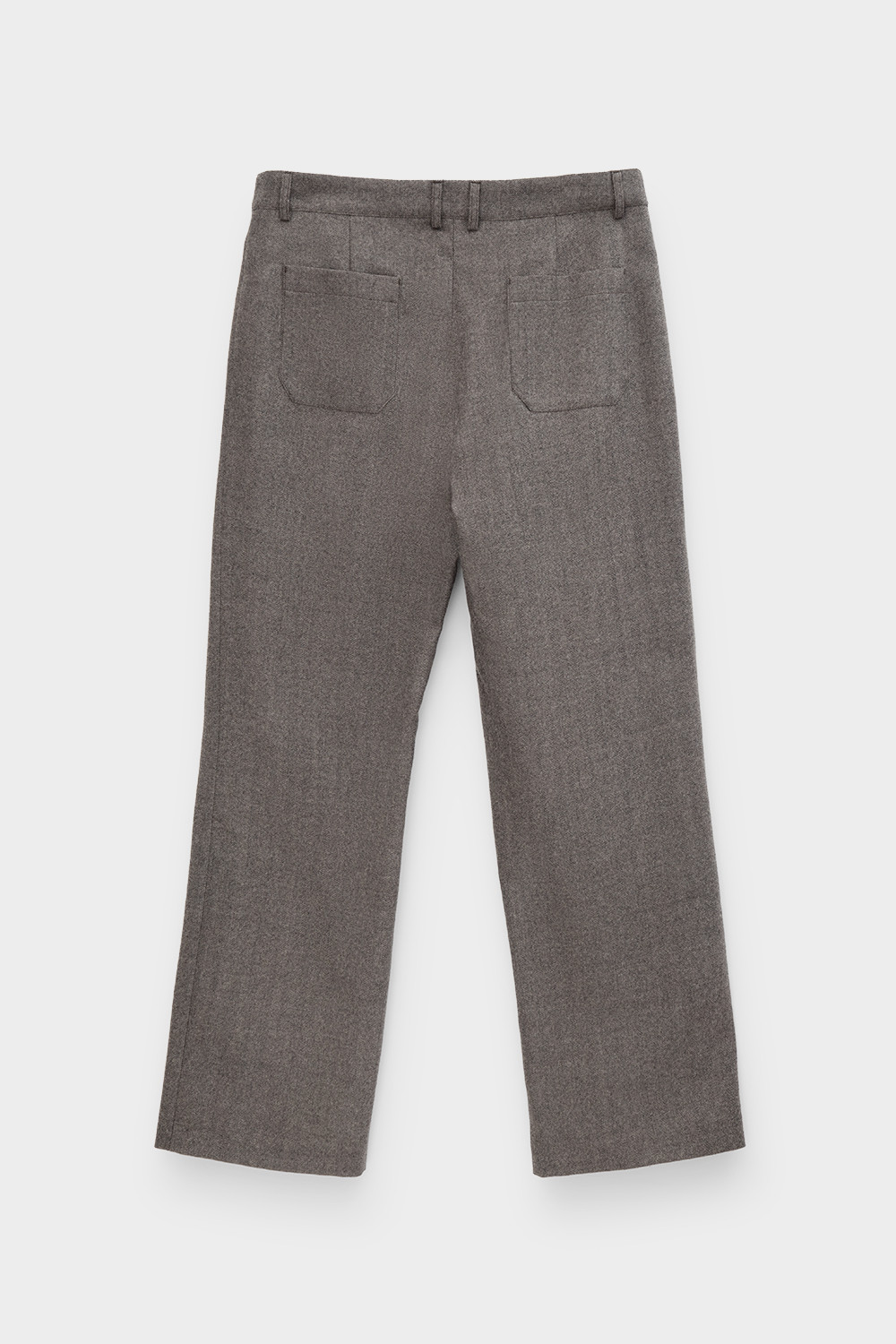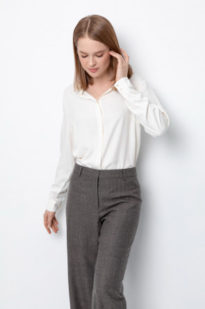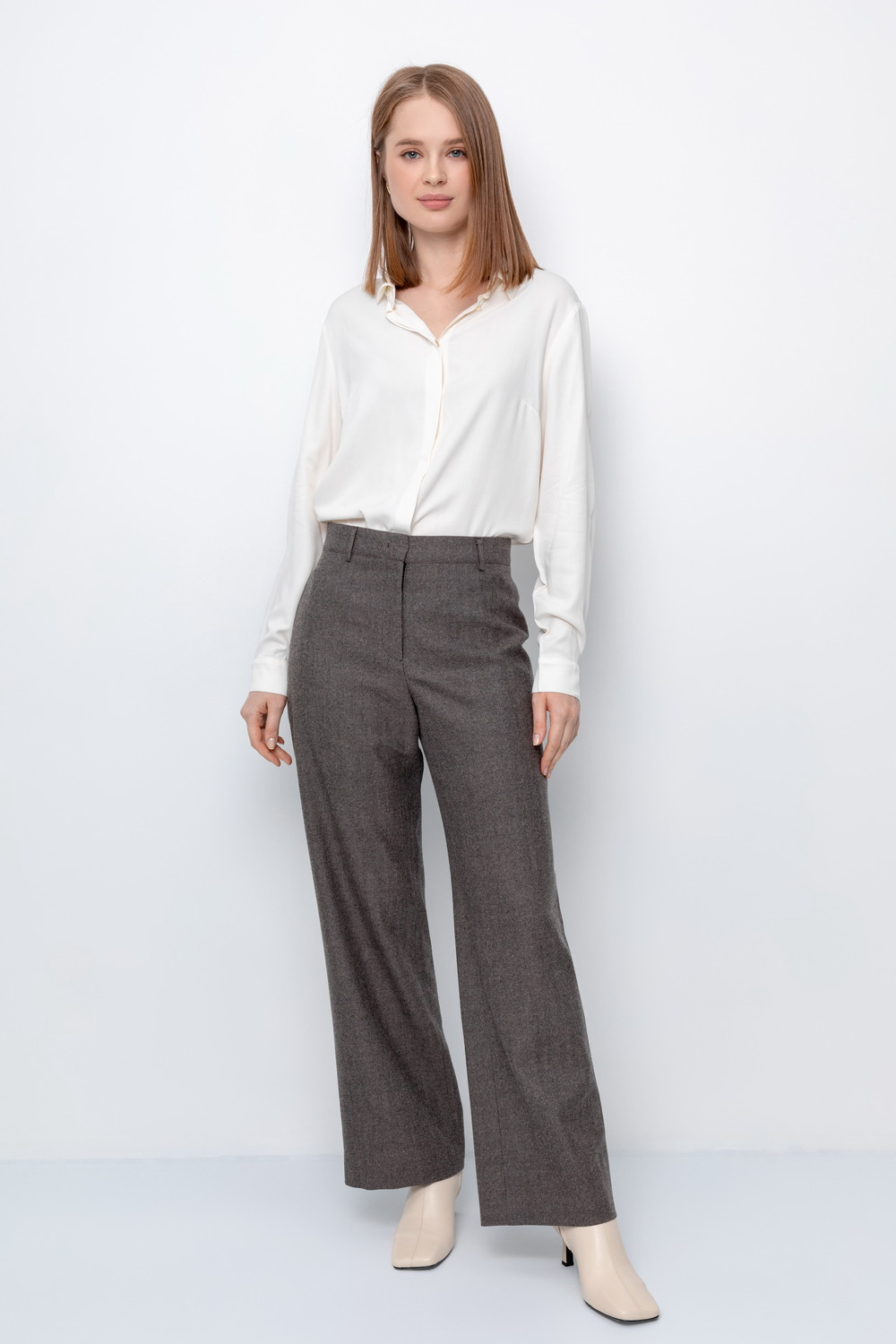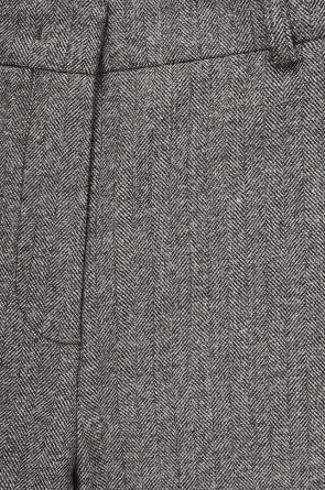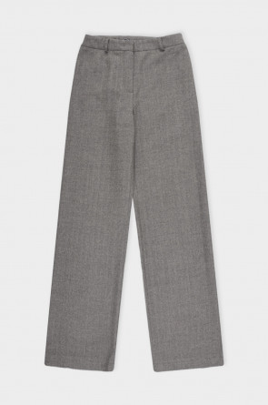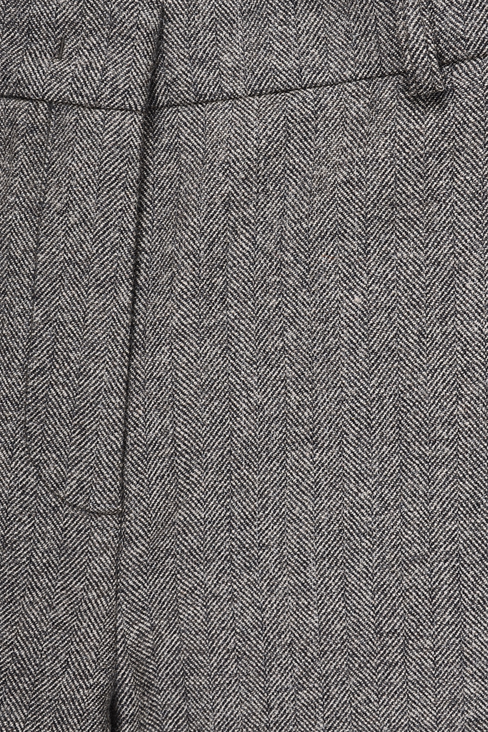 Широкие брюки из шерсти с узором "ёлочка" с завышенной линией талии. Застегивается спереди на молнию и брючный крючок. Пояс со шлевками для ремня.