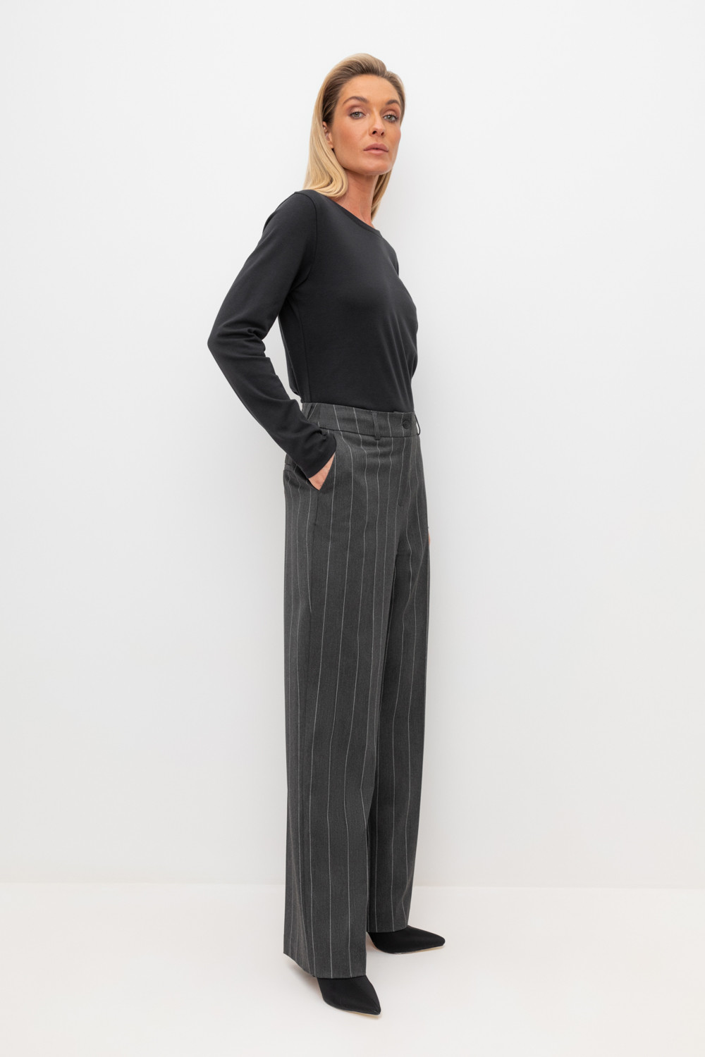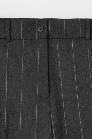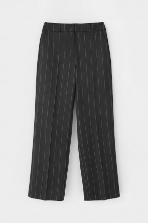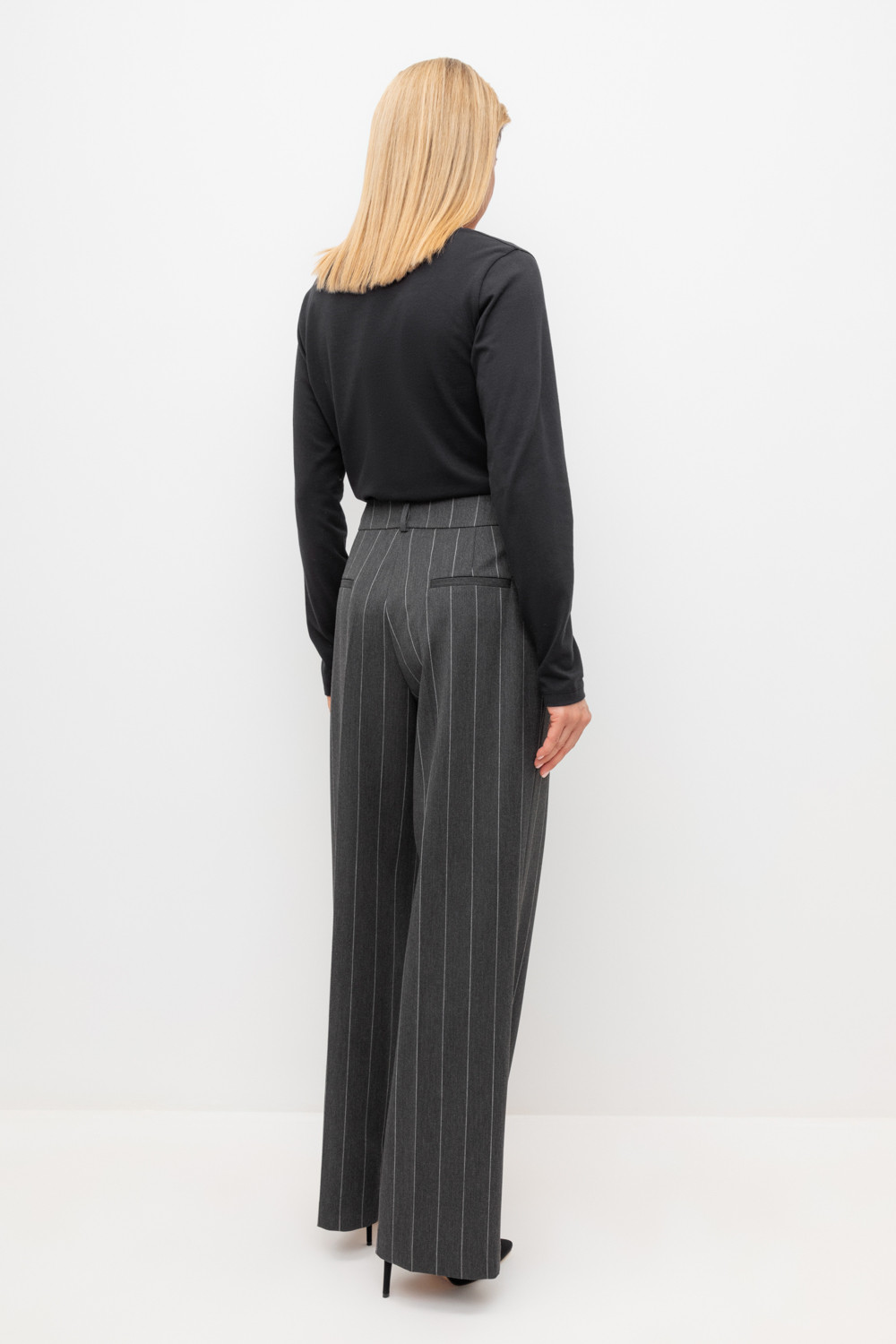 Широкие брюки из шерсти с завышенной линией талии. Застегивается спереди на молнию и пуговицу. Пояс со шлевками для ремня.