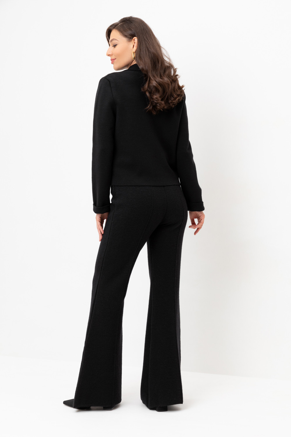 Удобные вязаные брюки со стрелкой из 100% шерсти. Шерсть в составе хорошо сохраняет тепло. Пояс на резинке.