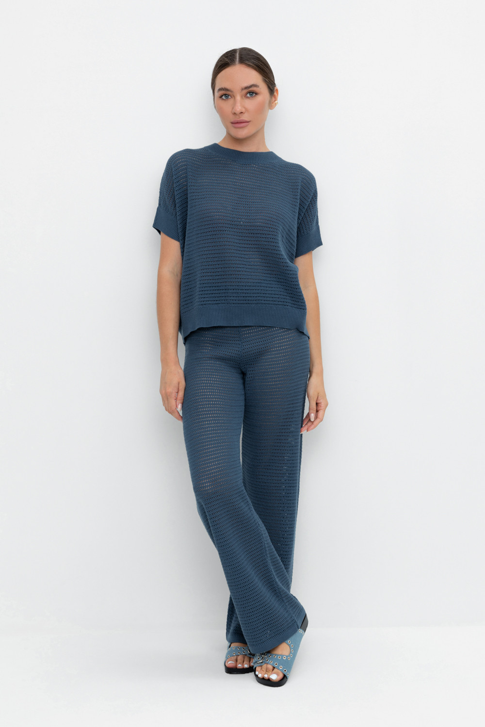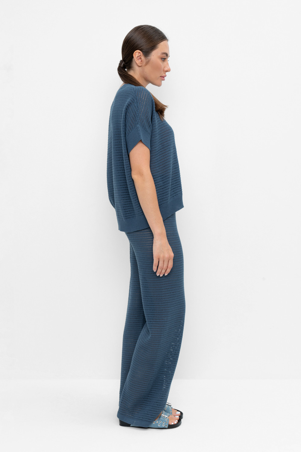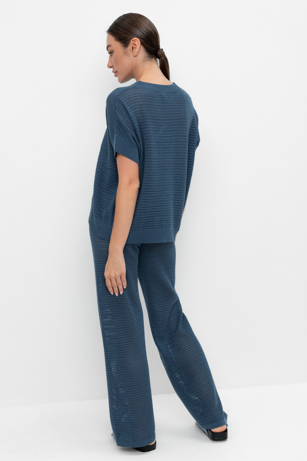 Вязаные ажурные свободные брюки с подкладом. Состав 50% хлопок, 50% акрил. Благодаря акрилу в составе изделие не пилингуется.