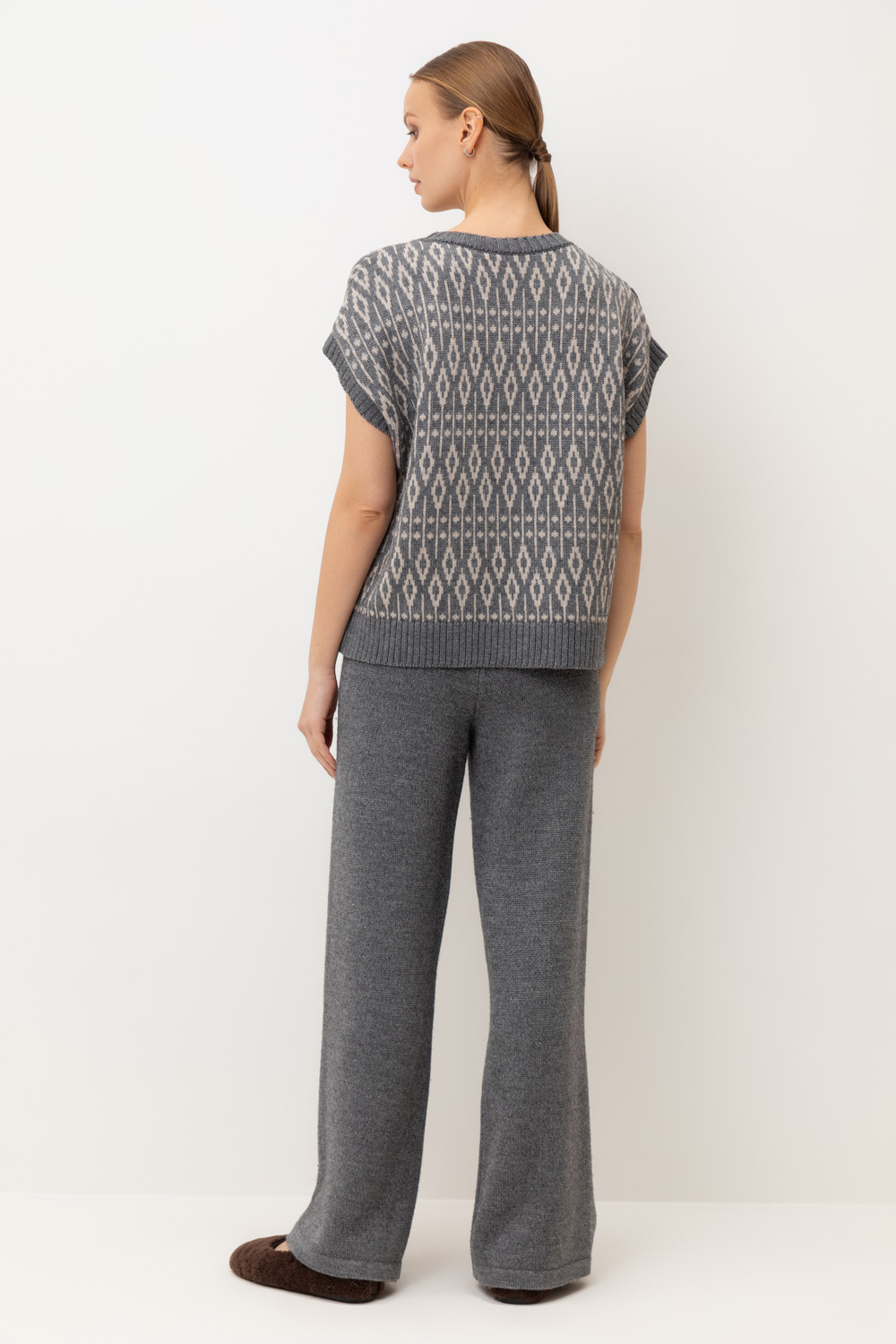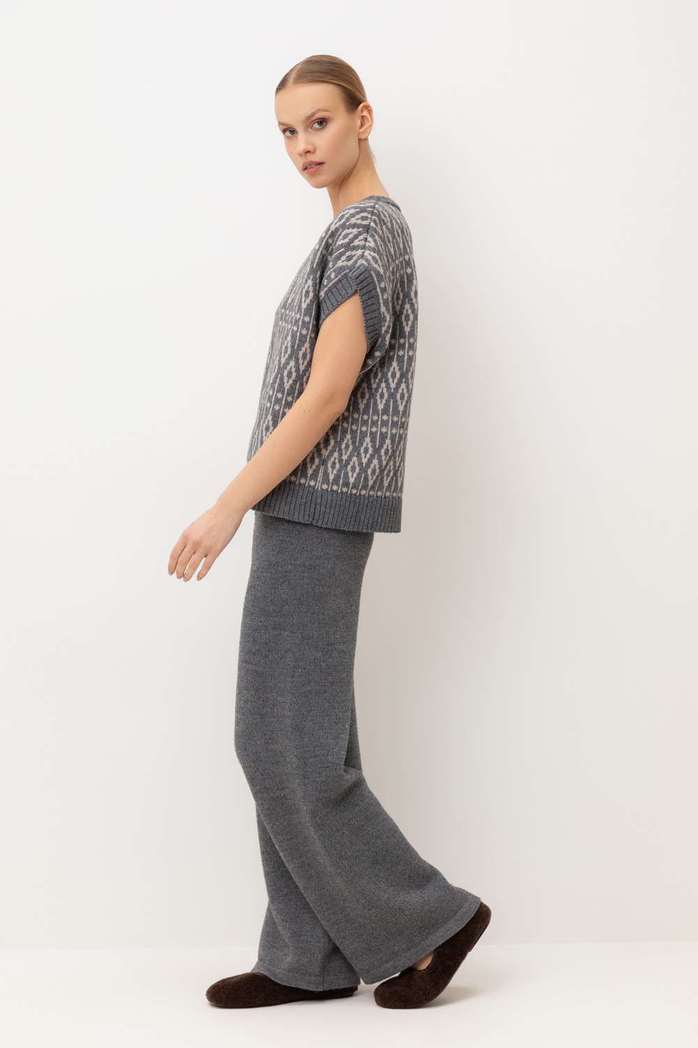 Мягкие брюки из премиальной пряжи, созданные с использованием инновационной технологии смешанного волокна. Уникальная технология производства позволила сформировать воздушную жаккардовую структуру, которая выглядит невероятно изысканно. Деликатное переплетение натуральной шерсти с современным акриловым волокном дарит непревзойденные тактильные ощущения.