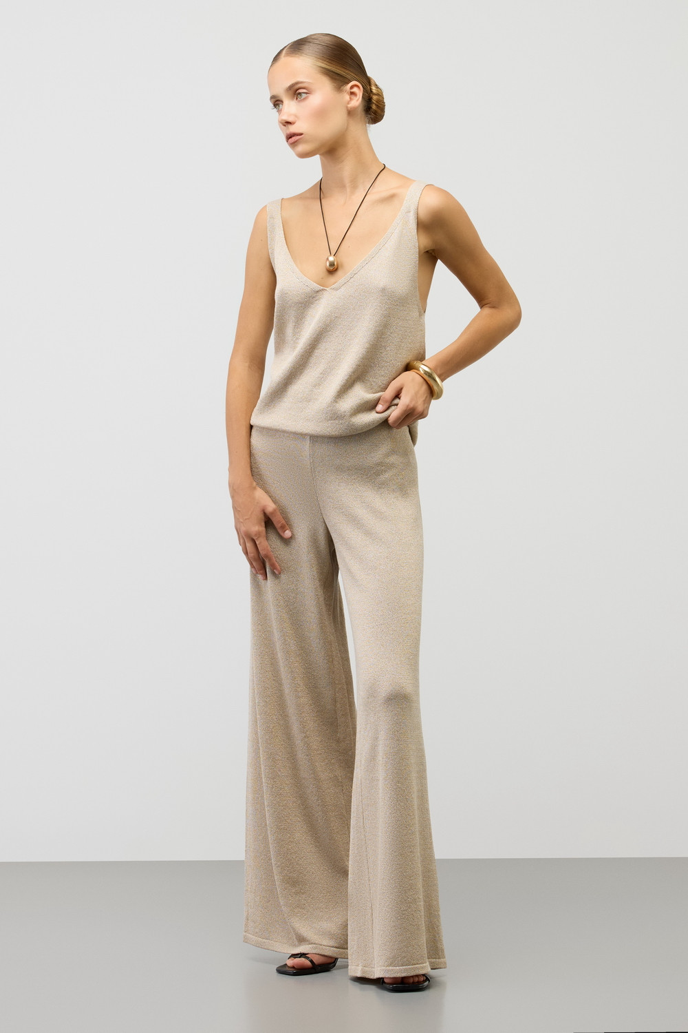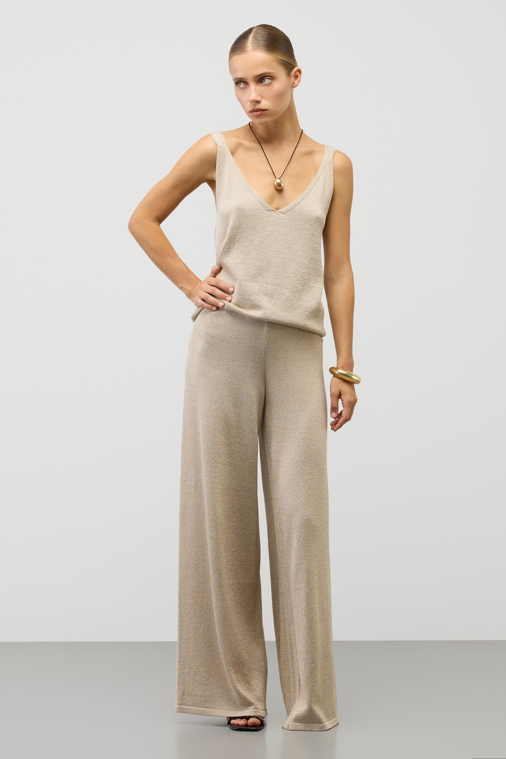 Гладкие брюки из итальянской вискозы. Светло-бежевый оттенок позволяет выбирать брюки для различных стилей, а в сочетании с гладким топом из вискозы получится стильный образ для летних дней.