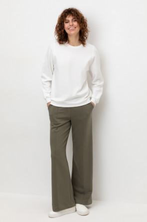 Брюки прямого кроя со стрелкой и боковыми карманами из мягкого петельчатого футера. В составе 80% натурального хлопка и 20% полиэстера, при этом полиэстер ввязан внутрь по особой технологии и не соприкасается с кожей. Пояс со шнурком позволяет регулировать посадку. Идеальный и комфортный вариант на каждый день.