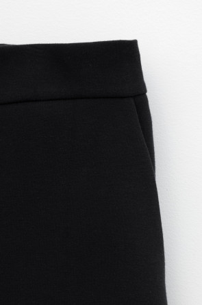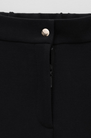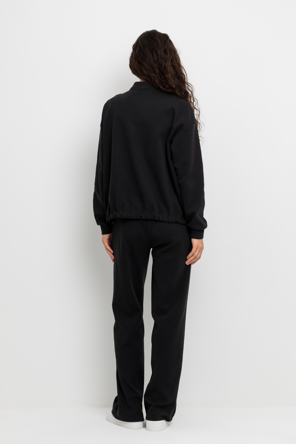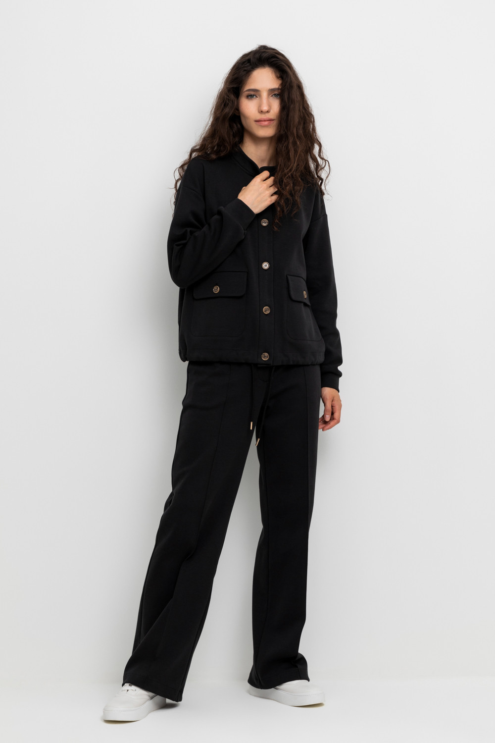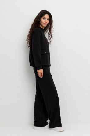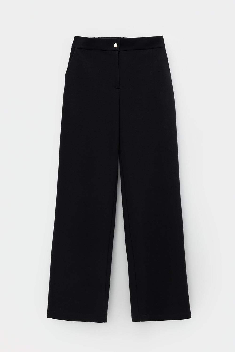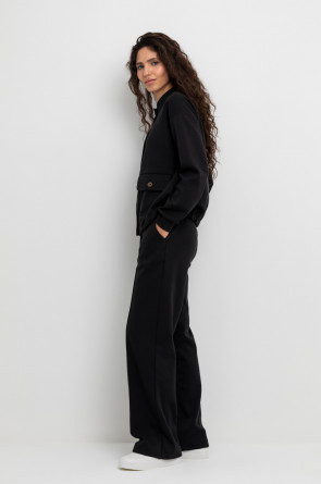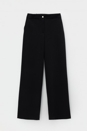 Свободные женские брюки со стрелками и боковыми карманами из плотного гладкого трикотажа интерлок. Застегиваются на молнию и кнопку. Низ обработан плоскими швами.