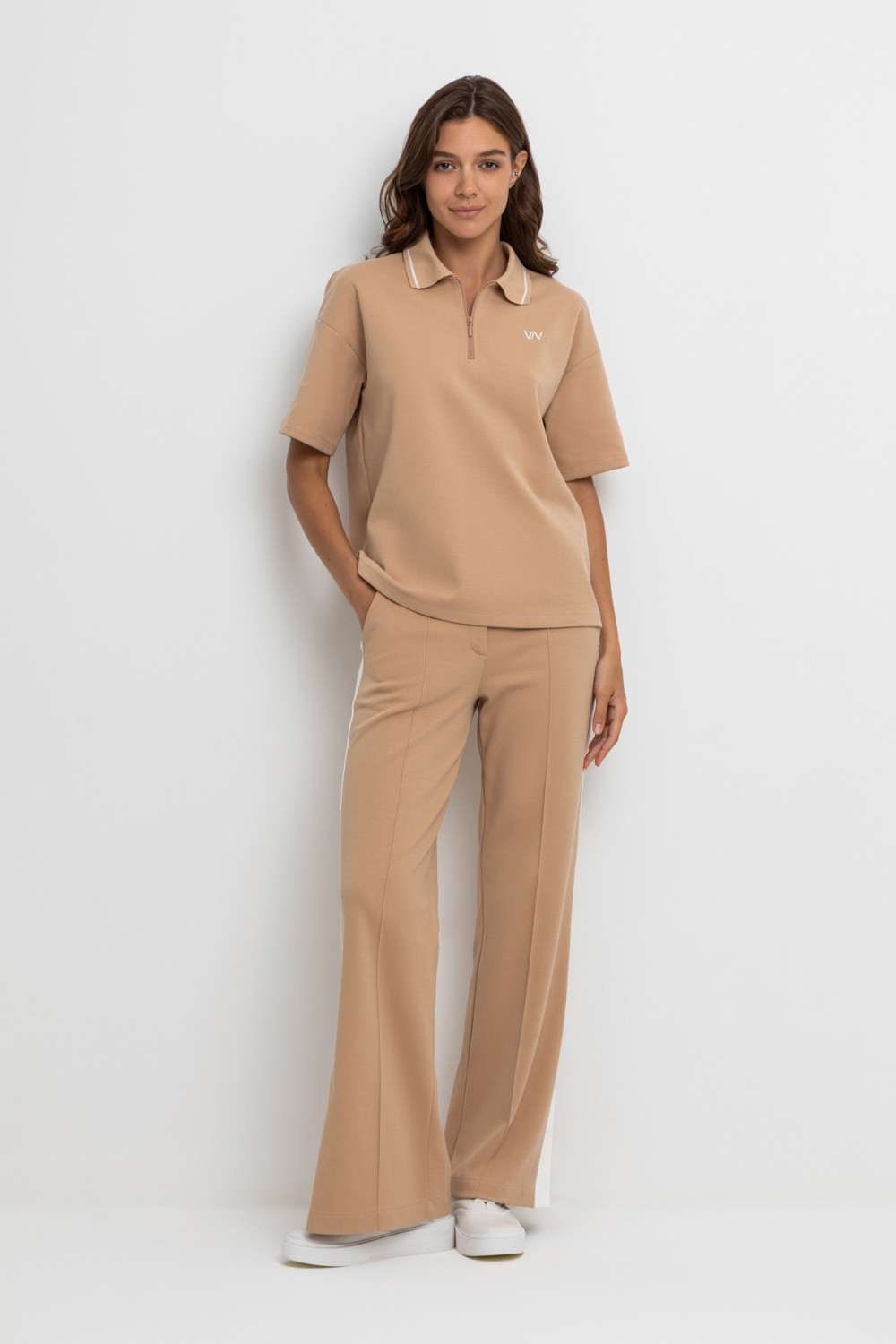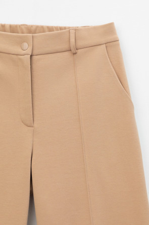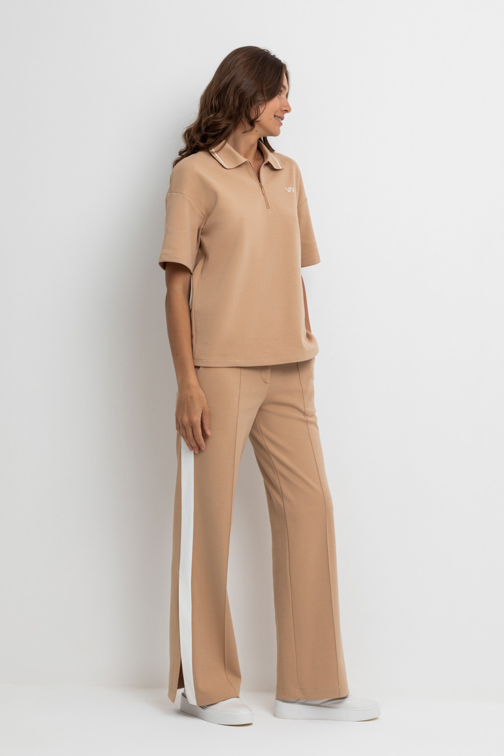 Свободные женские брюки со стрелками и боковыми карманами из плотного гладкого трикотажа интерлок. Модель с контрастными боковыми вставками и разрезами по низу. Застегиваются на молнию и кнопку. Низ обработан плоскими швами.