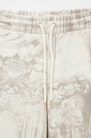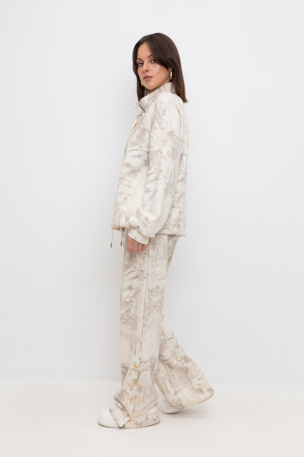 Свободные женские брюки с боковыми карманами из мягкого набивного футера двухнитки. Модель с разрезами по низу, застегивающиеся на кнопки. Низ обработан плоскими швами.