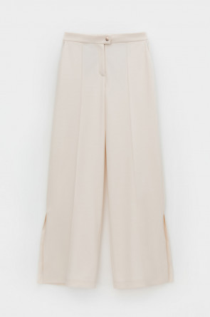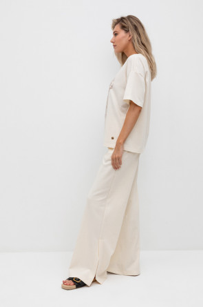 Свободные женские брюки с разрезами и боковыми карманами из плотного гладкого трикотажа интерлок. Низ обработан плоскими швами.