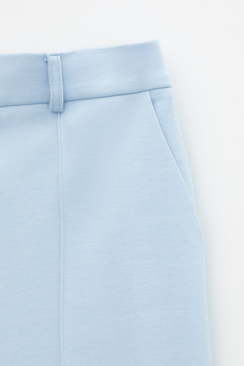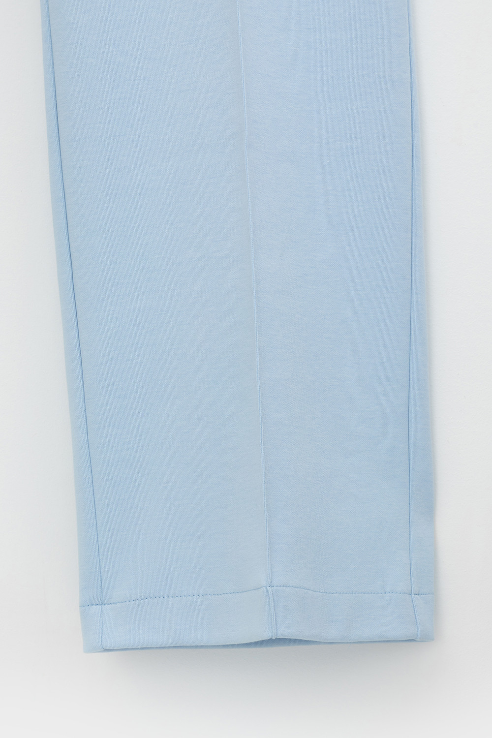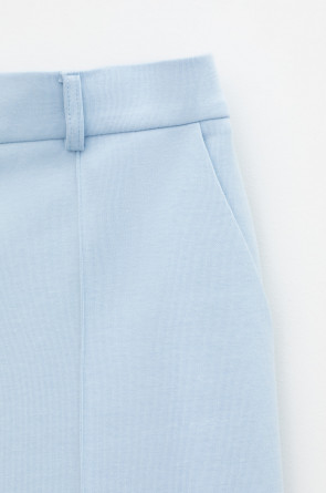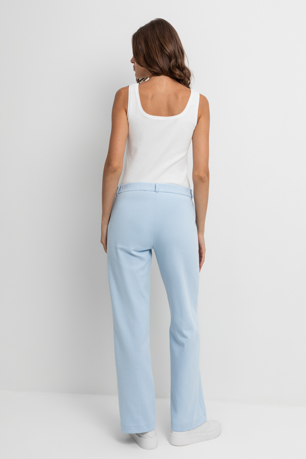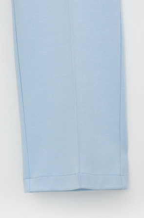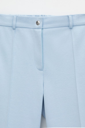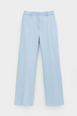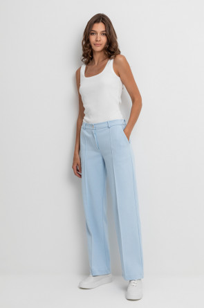 Свободные женские брюки со стрелками и боковыми карманами из плотного гладкого трикотажа интерлок. Застегиваются на молнию и кнопку. Низ обработан плоскими швами.