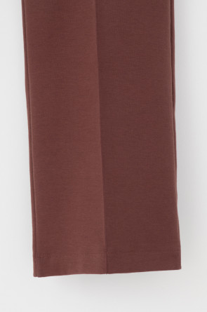 Свободные женские брюки со стрелками и боковыми карманами из плотного гладкого трикотажа интерлок. Застегиваются на молнию и кнопку. Низ обработан плоскими швами.
