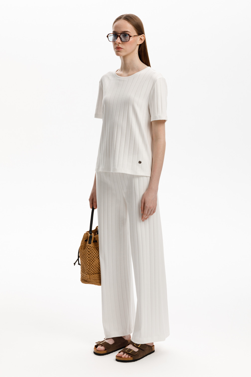 Свободные летние брюки из 100% гребенного хлопка. Необычное переплетение в виде широких полос придает изделию оригинальность, добавляя фактуры и динамики в образ. В сочетании с футболкой из этой коллекции, вы создадите стильный образ для летних дней.