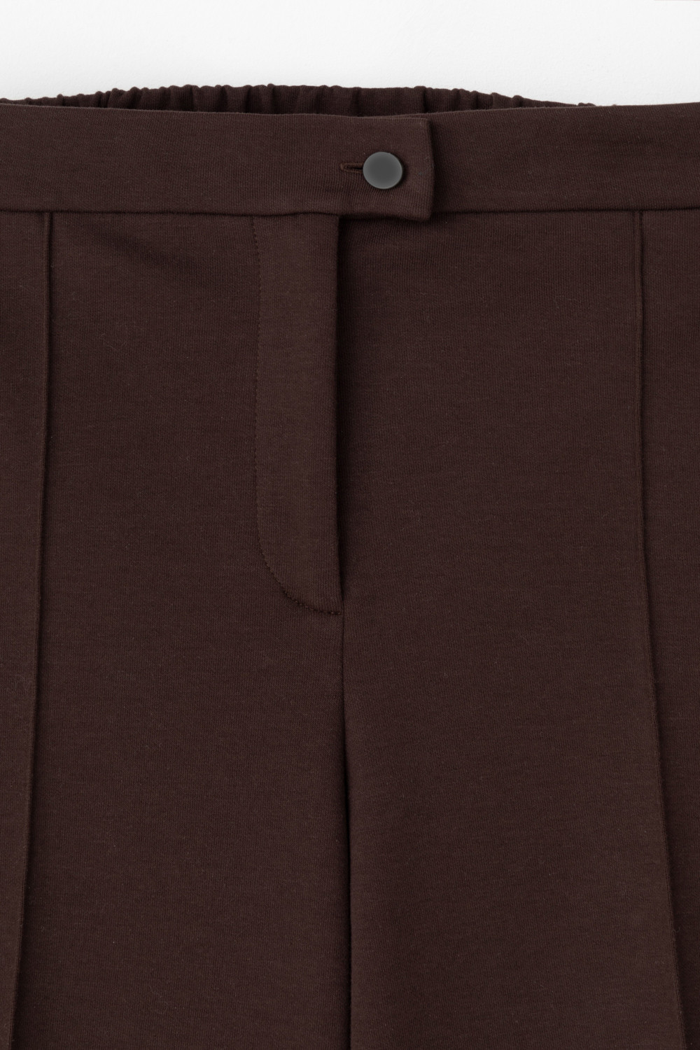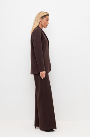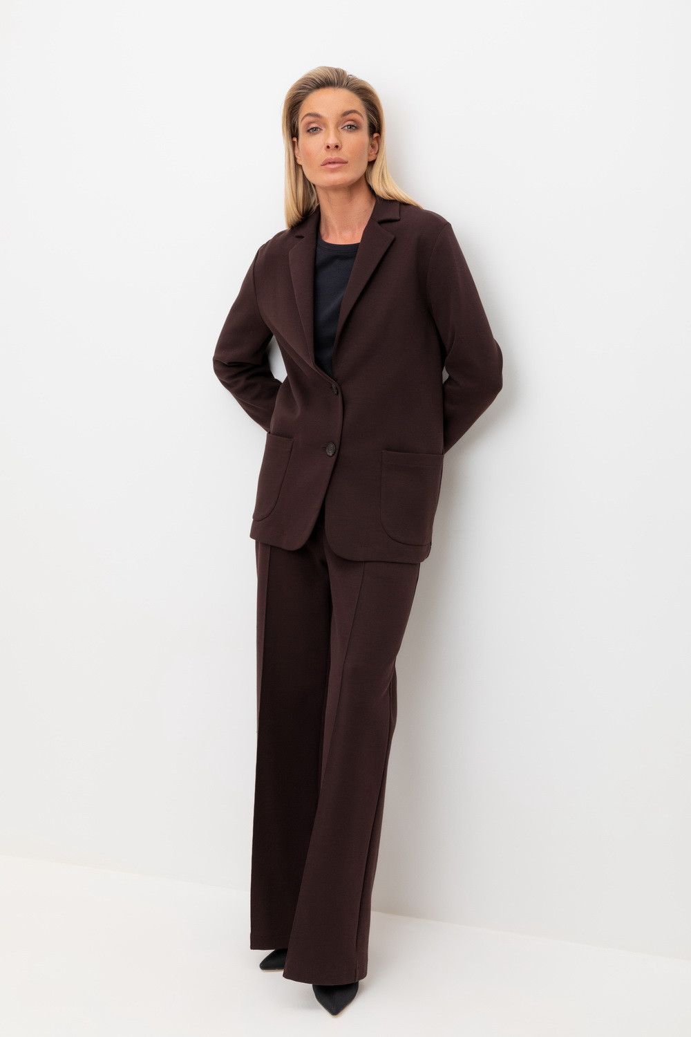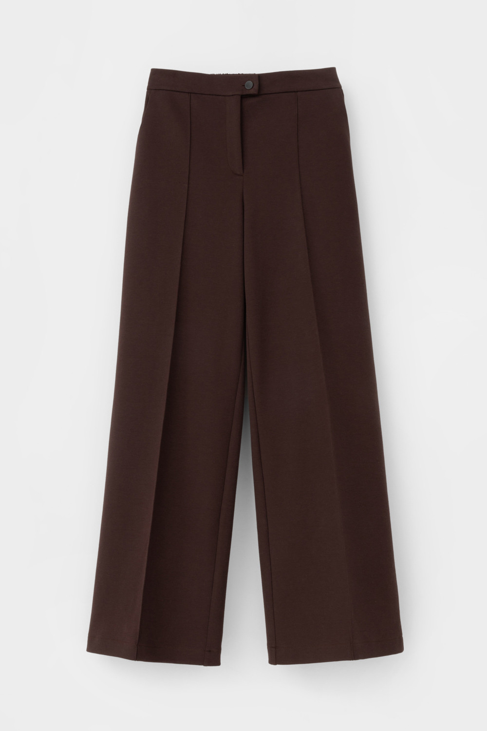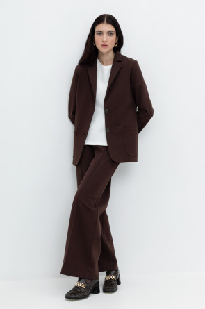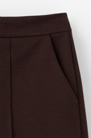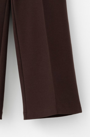 Свободные женские брюки со стрелкой и боковыми карманами из плотного гладкого трикотажа интерлок. Застежка на кнопку. Низ обработан плоскими швами.