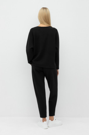 Женские брюки зауженного кроя с боковыми карманами из плотного гладкого трикотажа интерлок. Пояс со шнурком позволяет регулировать посадку.