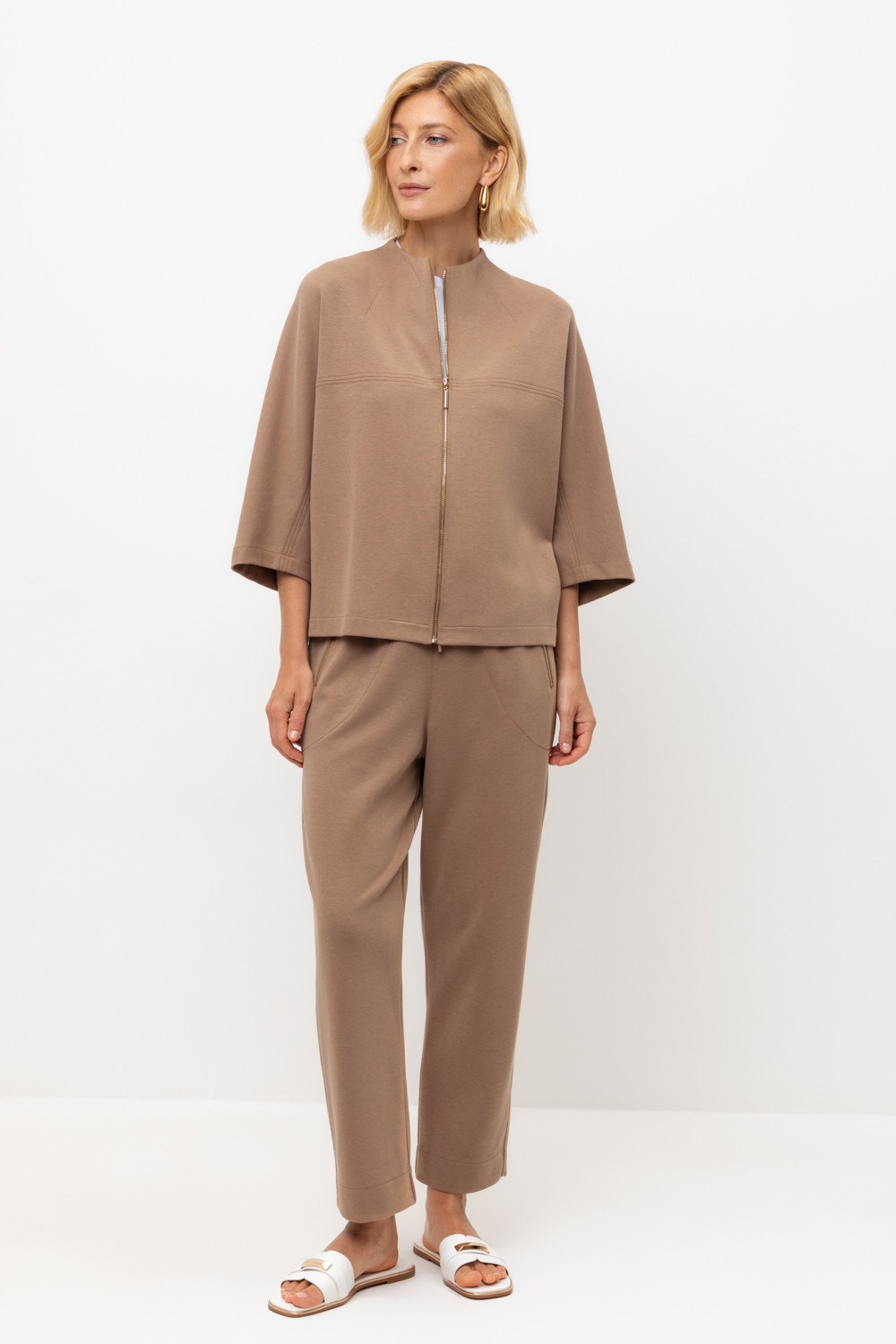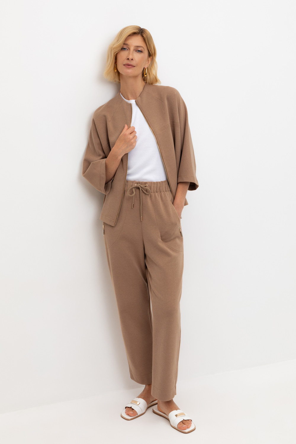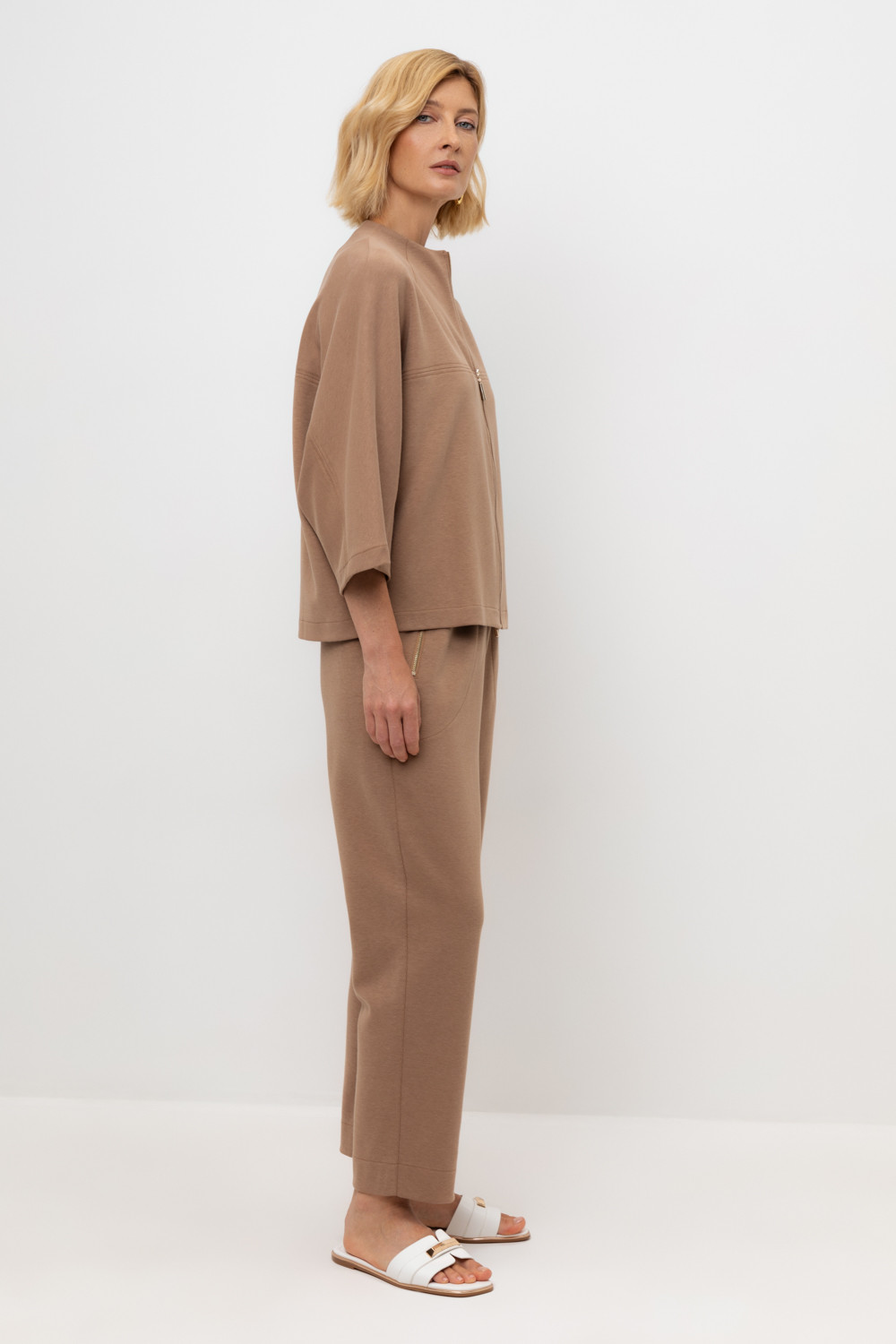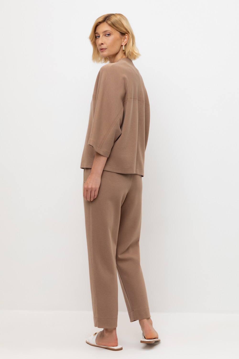 Брюки из высококачественного трикотажного полотна. За счет фактуры переплетения и специальных обработок сохраняют силуэт и форму. Хлопок в составе добавляет комфорт при носке. Эластичный пояс регулируемый шнуром обеспечивает идеальную посадку. В сочетании с жакетом из этой коллекции вы создадите расслабленный образ для летних дней.
