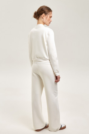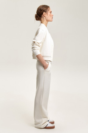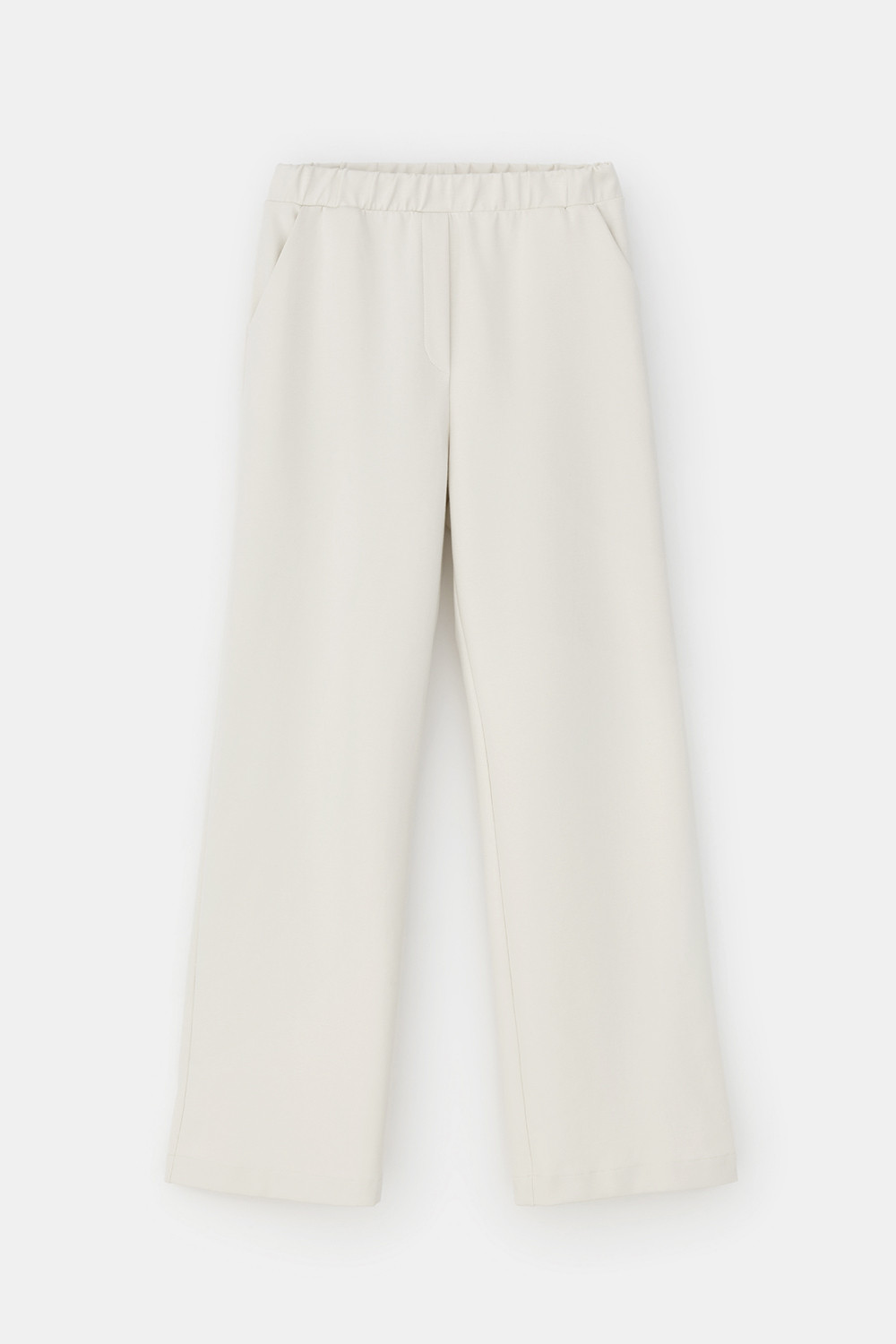 Брюки прямого кроя, изготовленные из премиального трикотажа DOUBLE FACE с добавлением спандекса. Имитация гульфика придает брюкам классический вид. Пояс с резинкой внутри обеспечивает идеальную посадку. Удобные карманы, аккуратно вписанные в общий силуэт, добавляют функциональности.