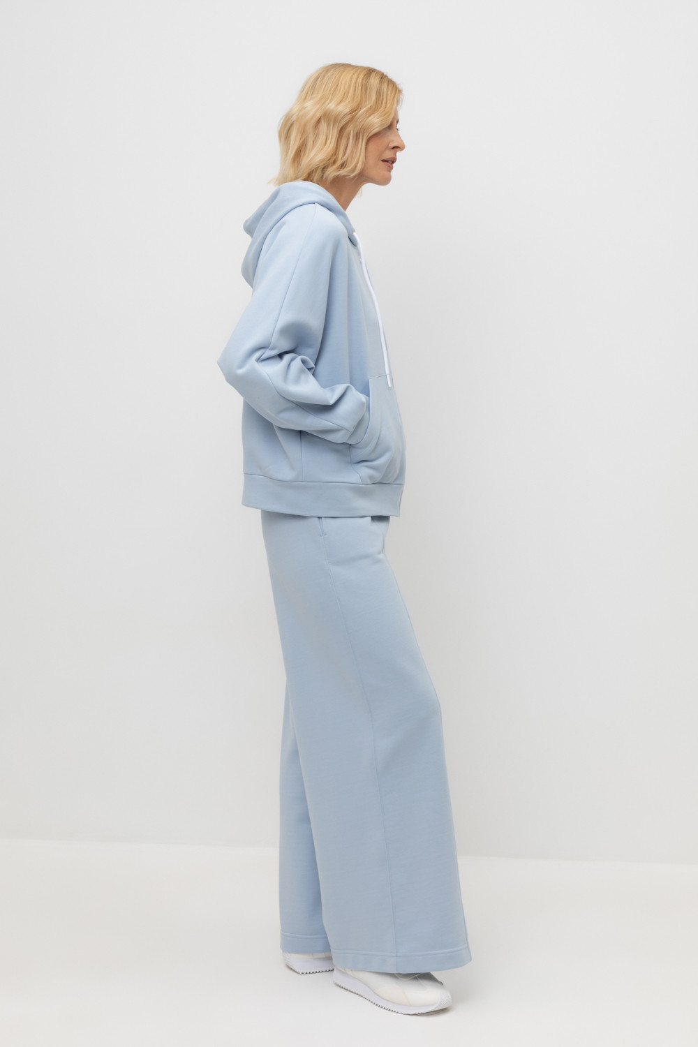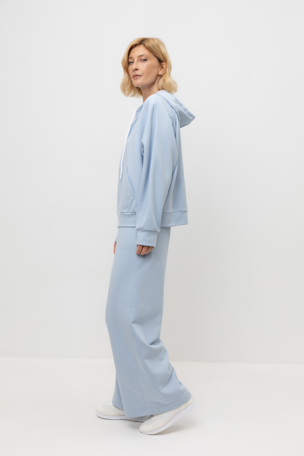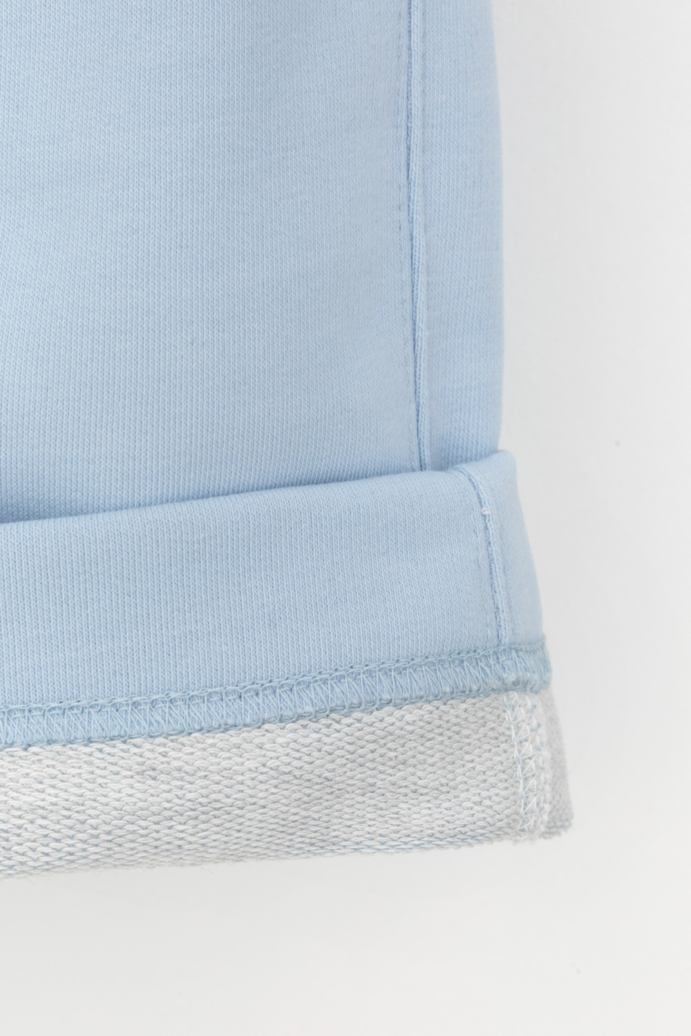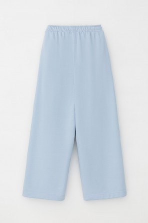 Брюки свободного силуэта со стрелками из мягкого двухцветного футера. Внутренняя сторона изделия представлена в натуральном цвете хлопка, внешняя в нежно-голубом. За счет использования крашенной пряжи, данный вид полотна прошел минимальную обработку, что придало изделию мягкость и шелковистость.