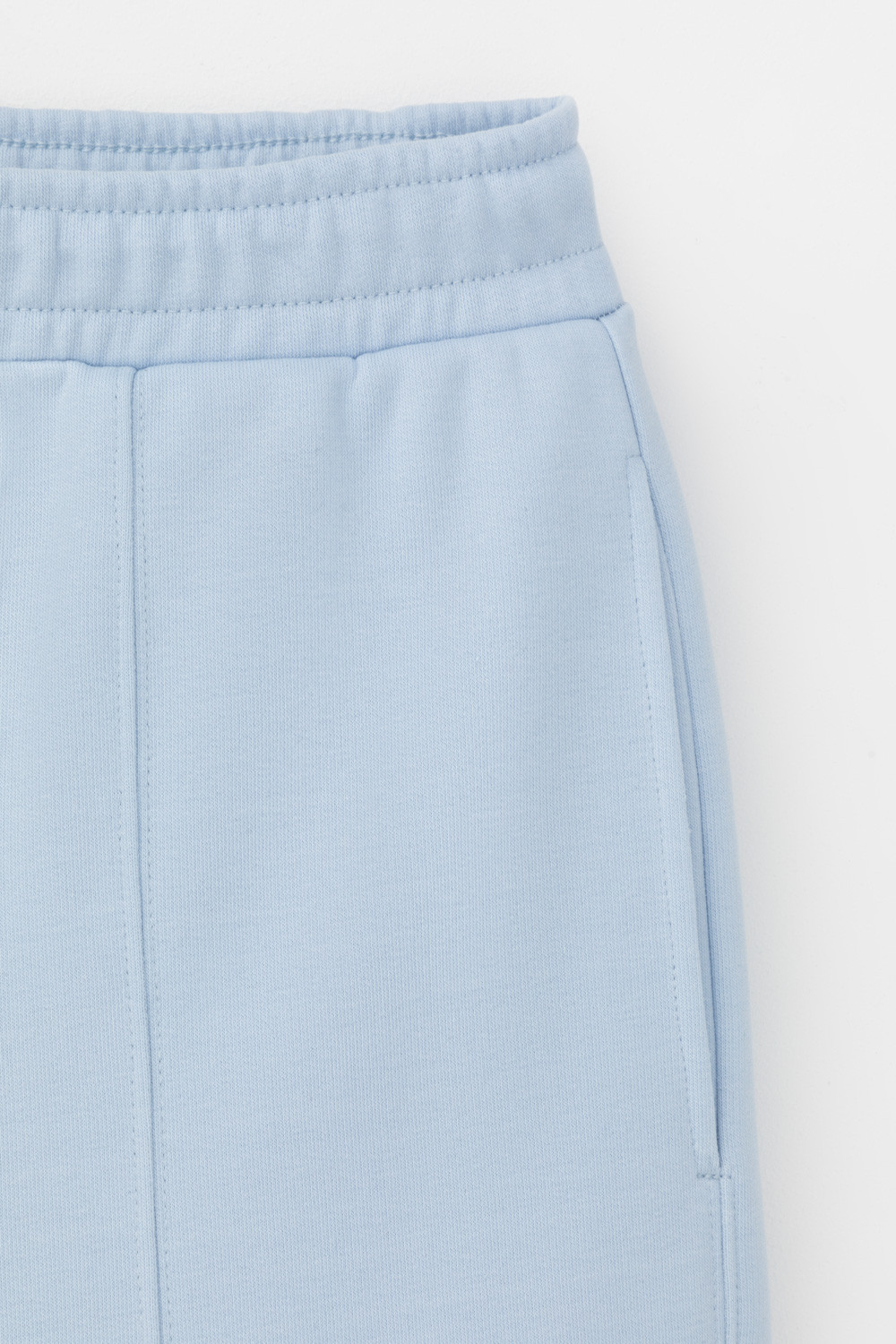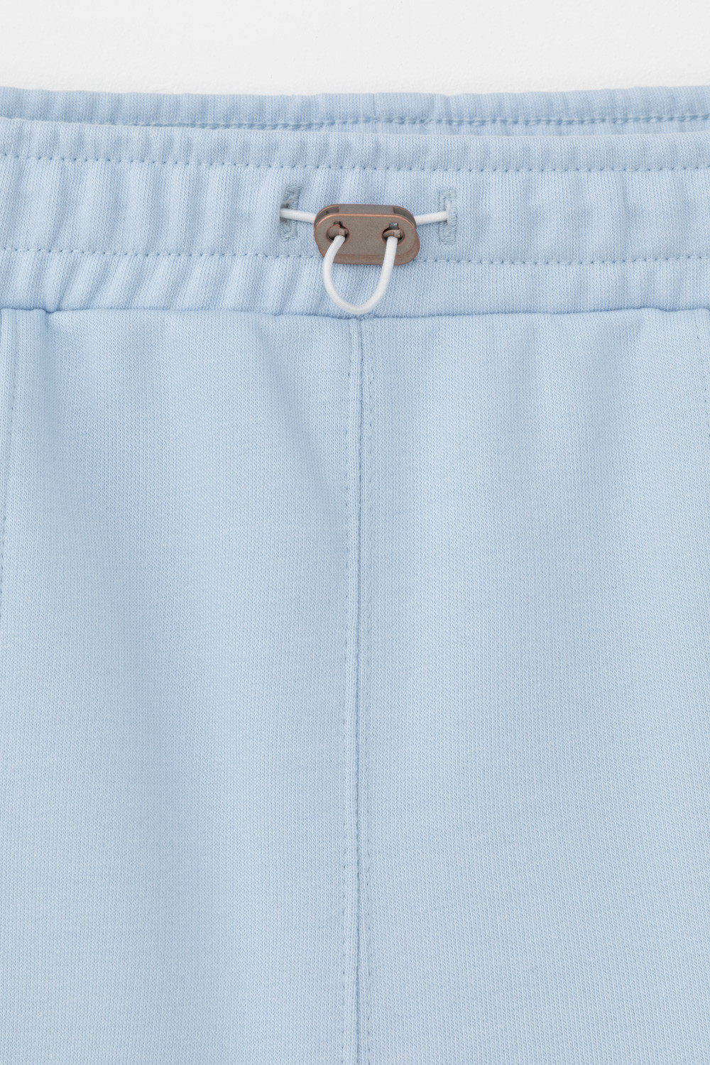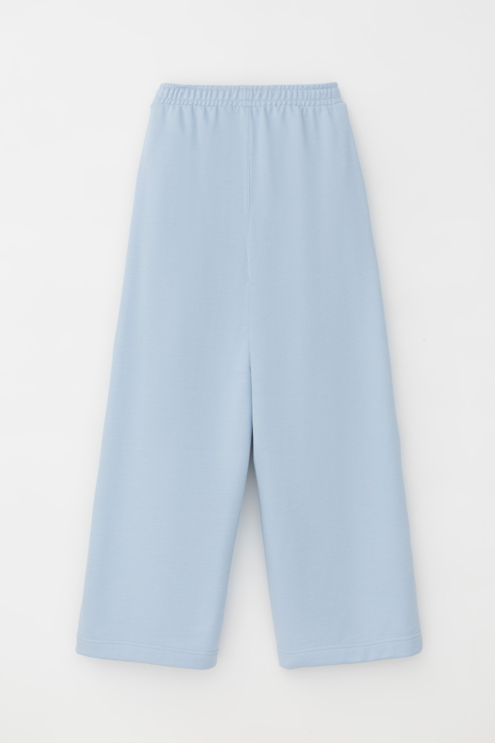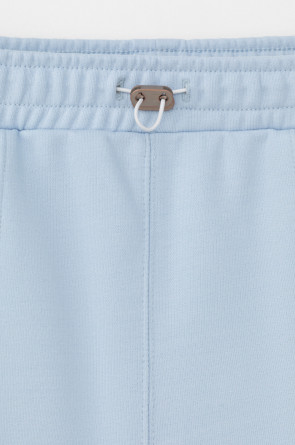Брюки свободного силуэта со стрелками из мягкого двухцветного футера. Внутренняя сторона изделия представлена в натуральном цвете хлопка, внешняя в нежно-голубом. За счет использования крашенной пряжи, данный вид полотна прошел минимальную обработку, что придало изделию мягкость и шелковистость.