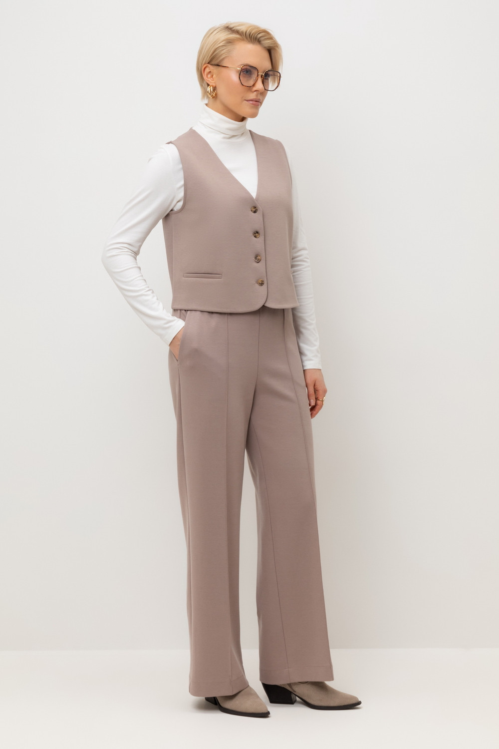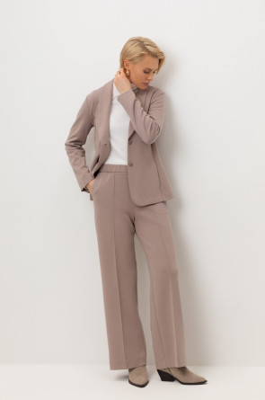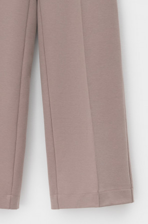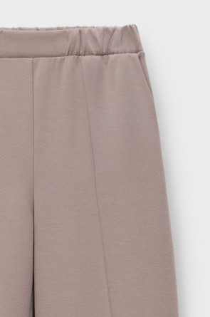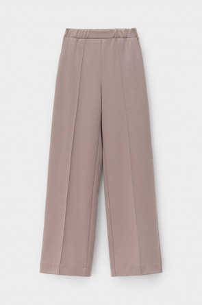 Брюки прямого кроя на резинке изготовлены из высококачественного трикотажного полотна DOUBLE FACE. Трикотаж прошел специальную каучуковую обработку, что придает ему легкость и шелковистую текстуру. Прямой крой вытягивает силуэт, формируя элегантный классический образ. Боковые карманы добавляют изделию практичности.