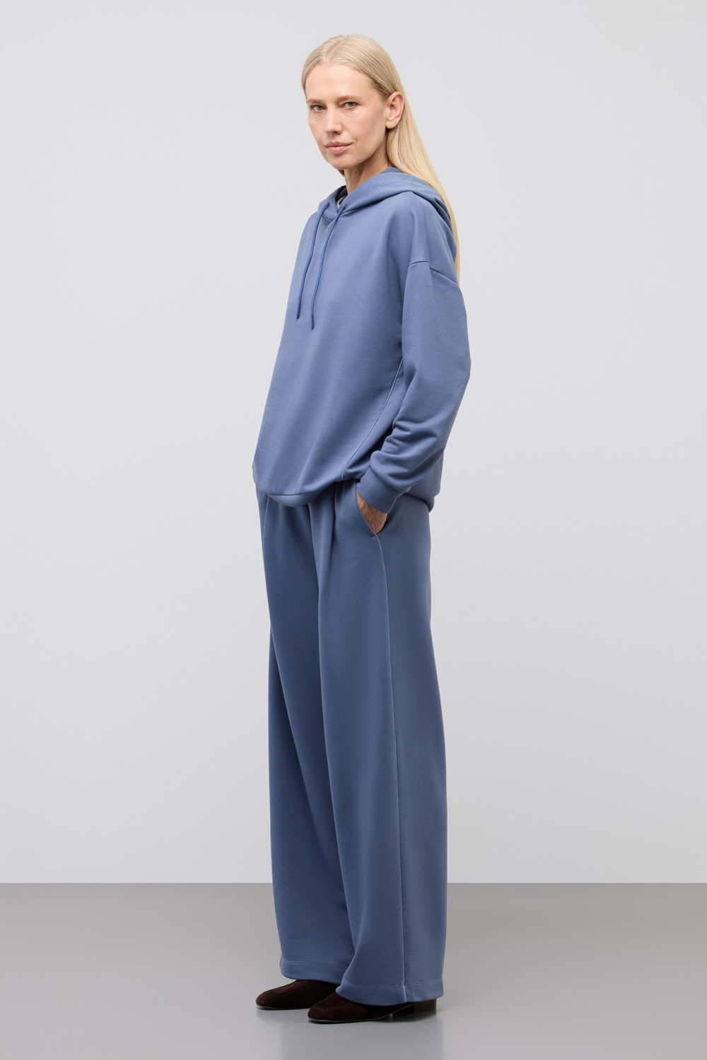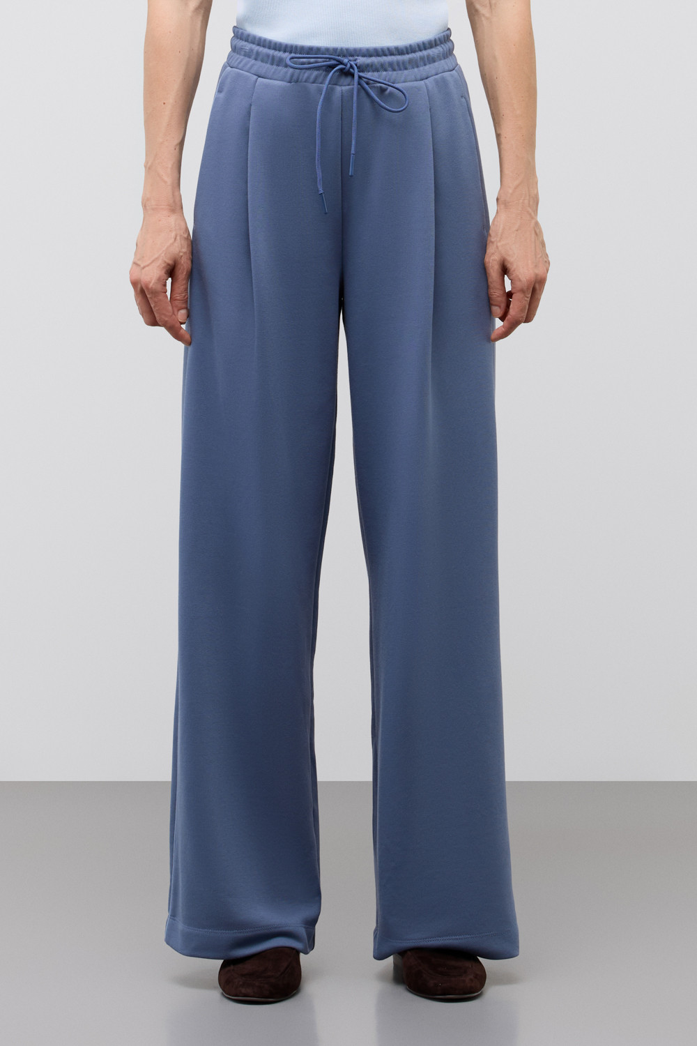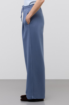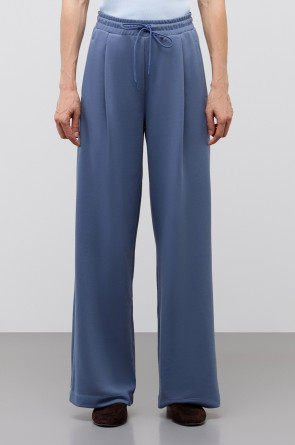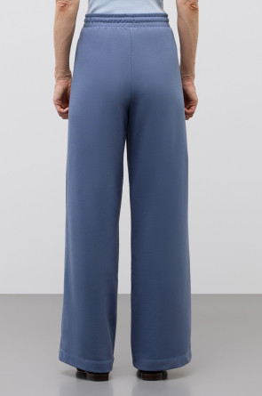 Брюки из хлопкового футера придают образу спортивный стиль за счет отделки атласным кантом контрастного цвета. Прямой крой добавляет расслабленности и удобства образу.