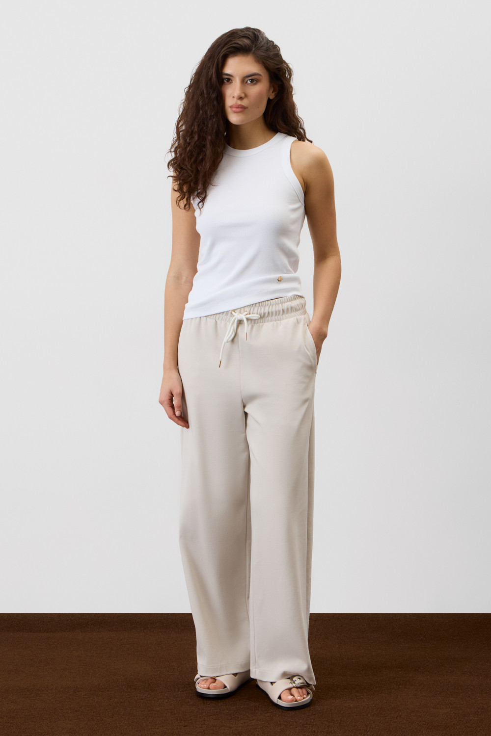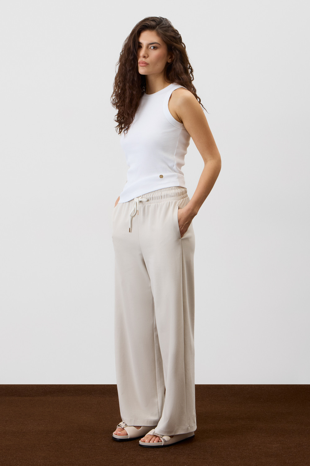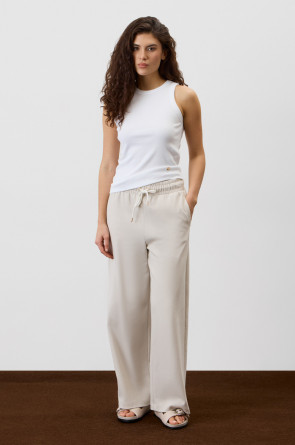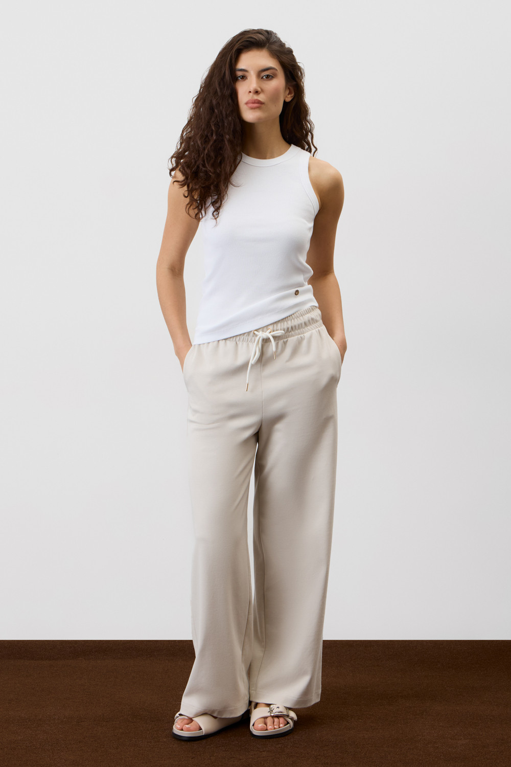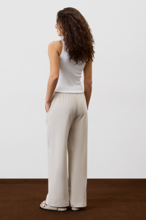 Классические брюки из премиального трикотажа прямого кроя создают расслабленный образ. Удобные карманы добавляют практичности. Универсальный оттенок позволяет сочетать и комбинировать различные стили.