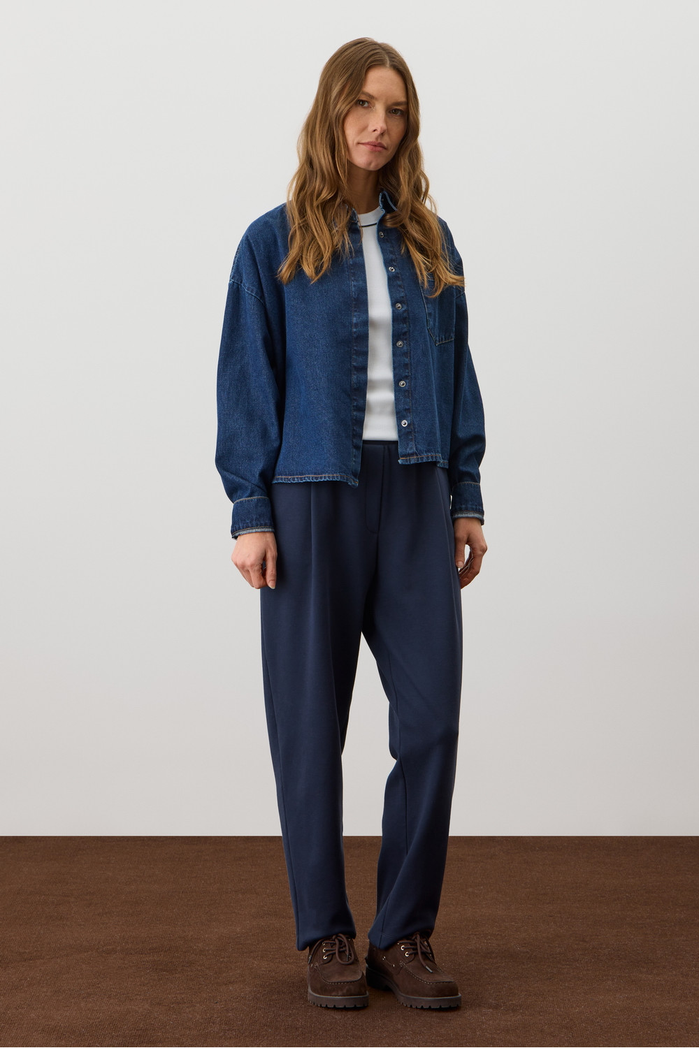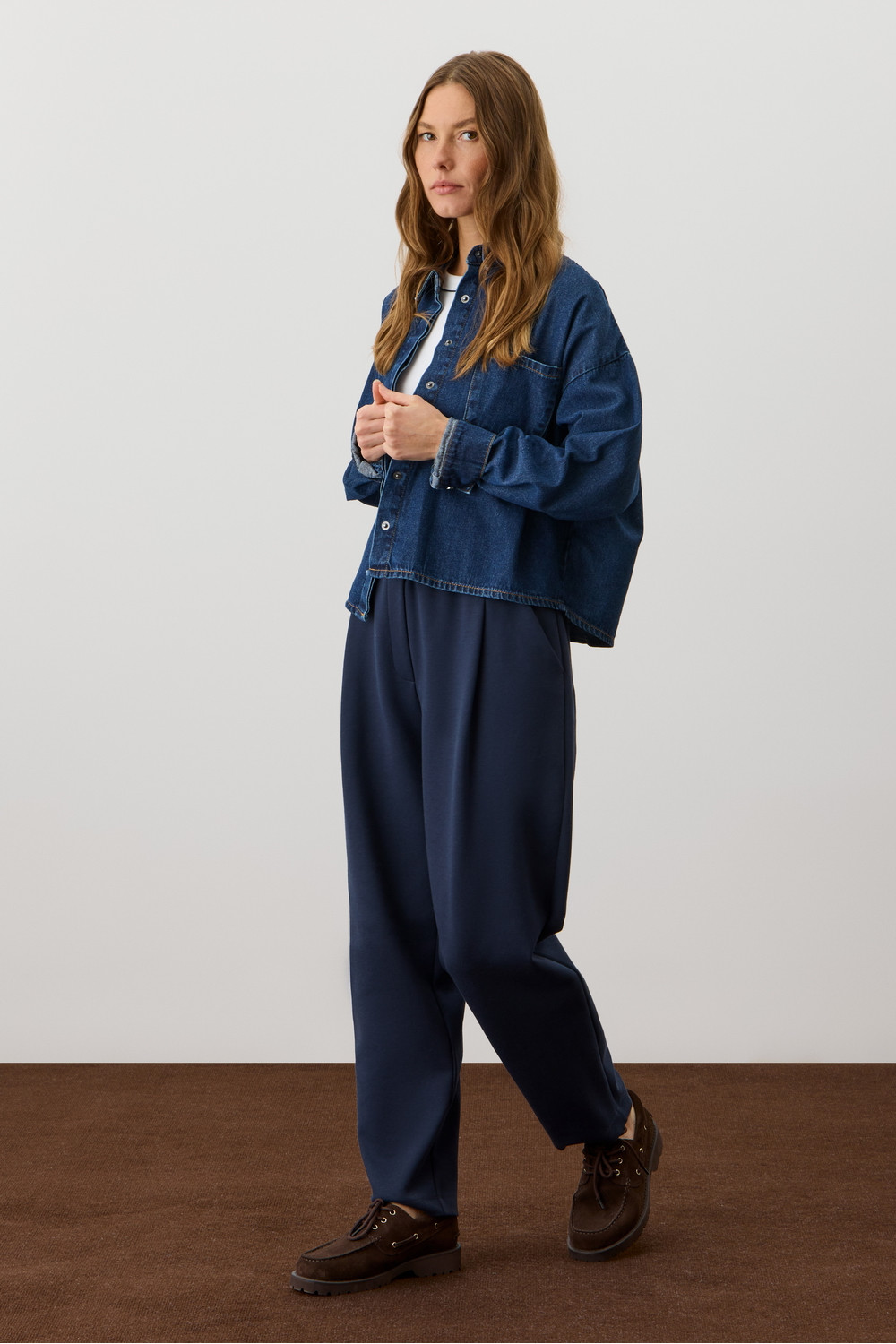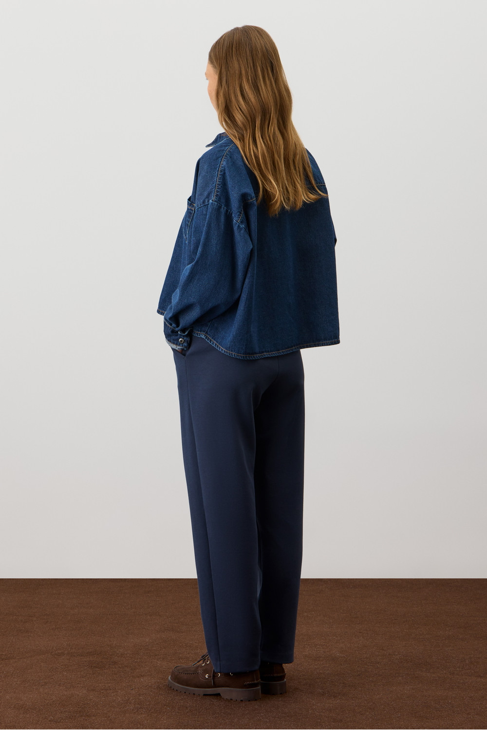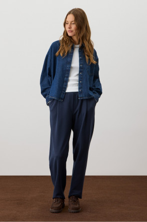 Брюки из мягкого хлопка являются универсальным элементом в гардеробе. Защипы спереди создают текстуру и визуальную динамику, а имитация гульфика придает брюкам классический вид.