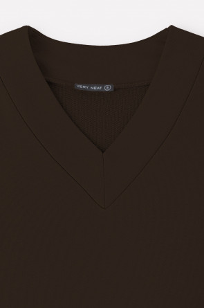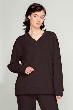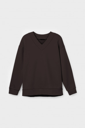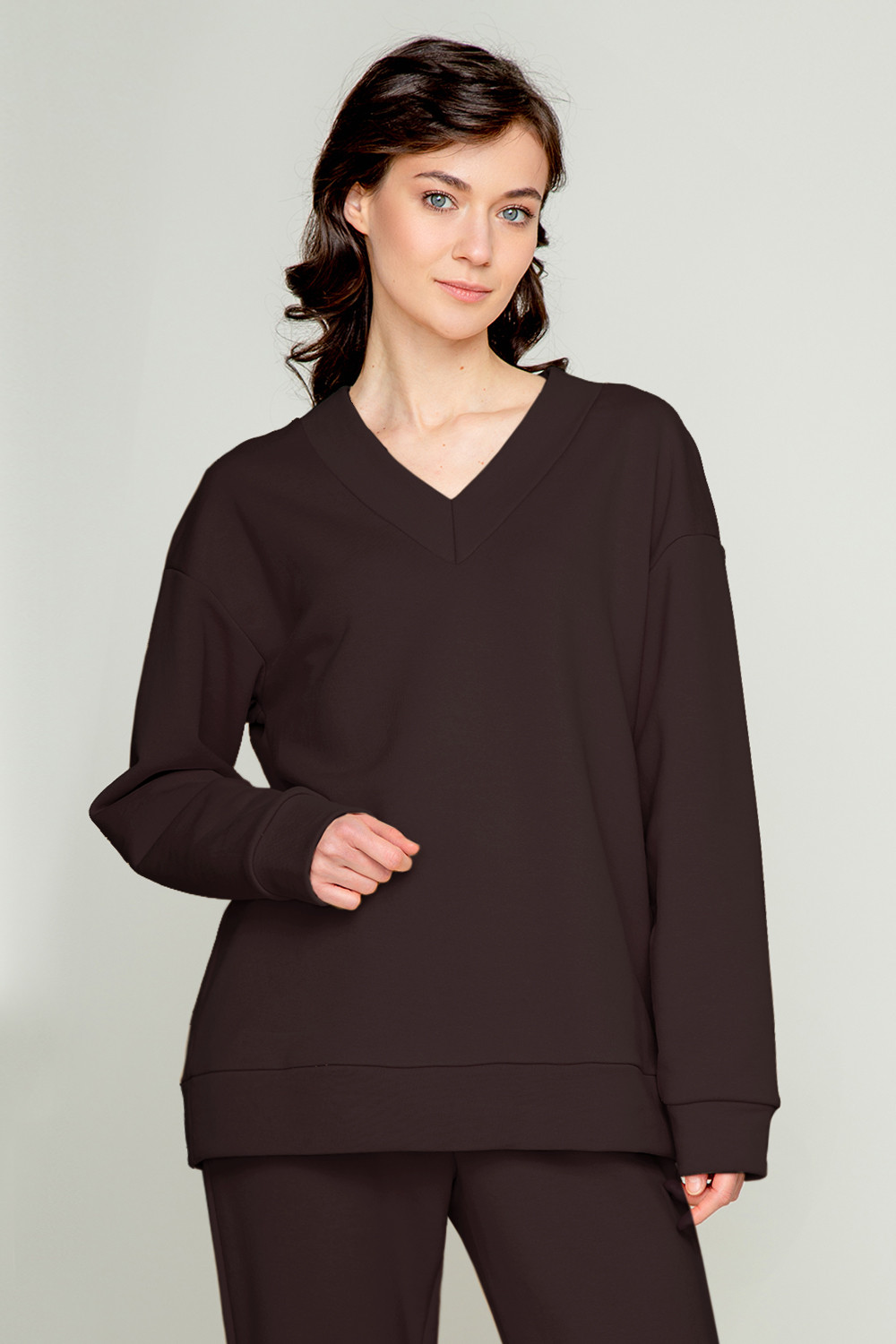 Мягкий однотонный джемпер с V-образным вырезом и длинными рукавами из мягкого петельчатого футера трёхнитка. Воротник, манжеты и пояс выполнены из основного полотна. В составе 80% натурального хлопка и 20% полиэстера, при этом полиэстер ввязан внутрь по особой технологии и не соприкасается с кожей. Свободная посадка и спущенные плечи придают джемперу объём .