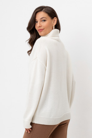 Уютный вязаный джемпер из полушерстяной пряжи. Шерсть в составе сохраняет тепло, а волокна акрила добавляют мягкость и объем. Выполнен гладью. Комфортная длинные цельнокроеные рукава придают изделию объем.