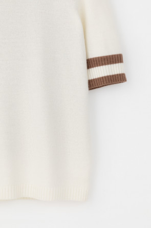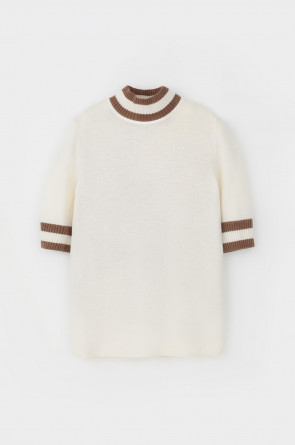 Джемпер в стиле прямой футболки, воротником-стойкой и короткими рукавами. Прямой силуэт, стандартная длина. Средняя плотность вязания, пластичная фактура. Выполнен гладью из мягкой полушерстяной пряжи. Шерсть в составе сохраняет тепло, а благодаря волокнам акрила изделие мягкое и дольше сохраняет форму.