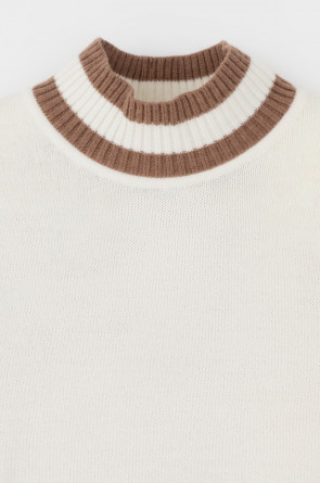 Джемпер в стиле прямой футболки, воротником-стойкой и короткими рукавами. Прямой силуэт, стандартная длина. Средняя плотность вязания, пластичная фактура. Выполнен гладью из мягкой полушерстяной пряжи. Шерсть в составе сохраняет тепло, а благодаря волокнам акрила изделие мягкое и дольше сохраняет форму.