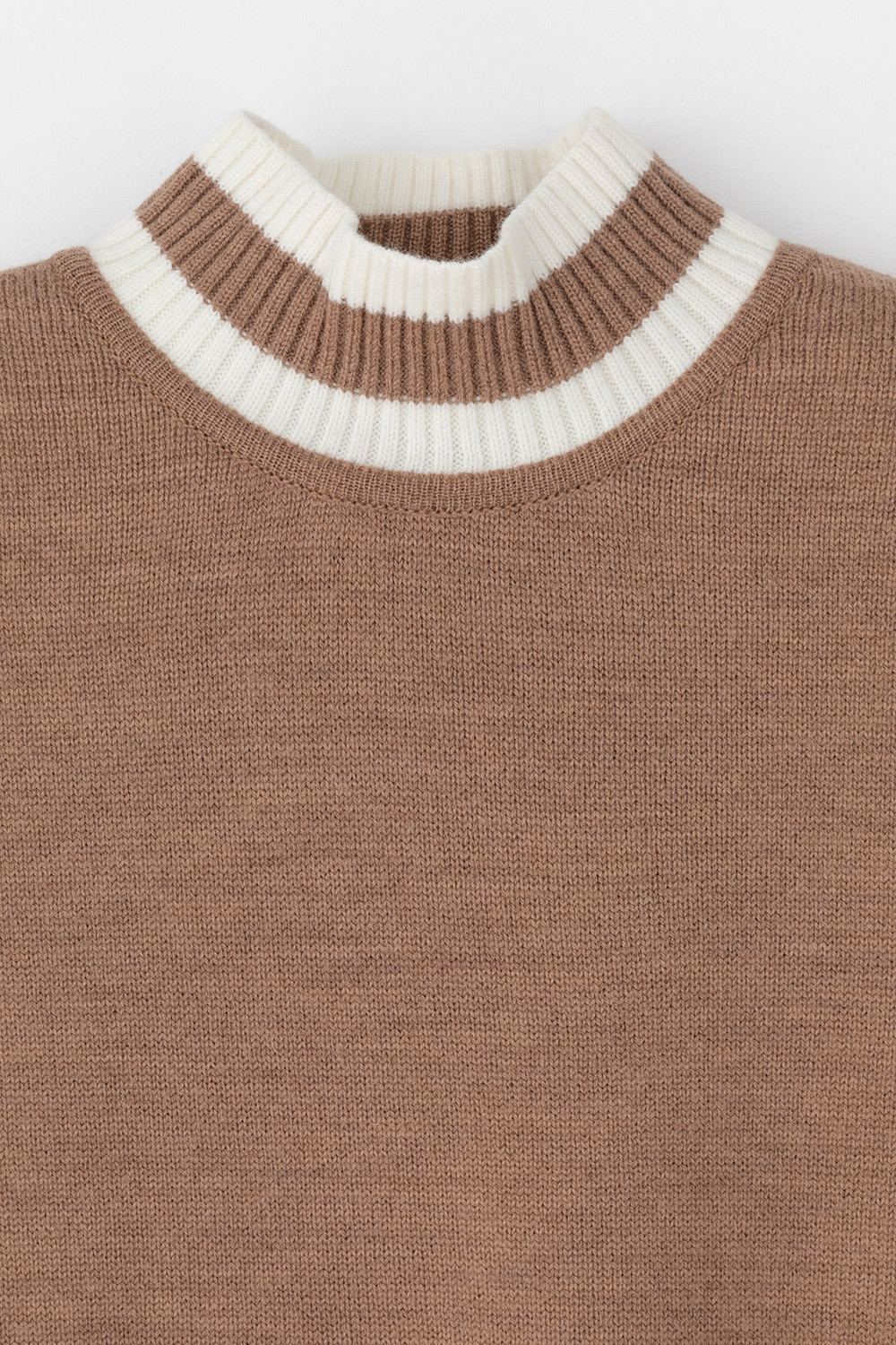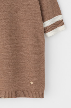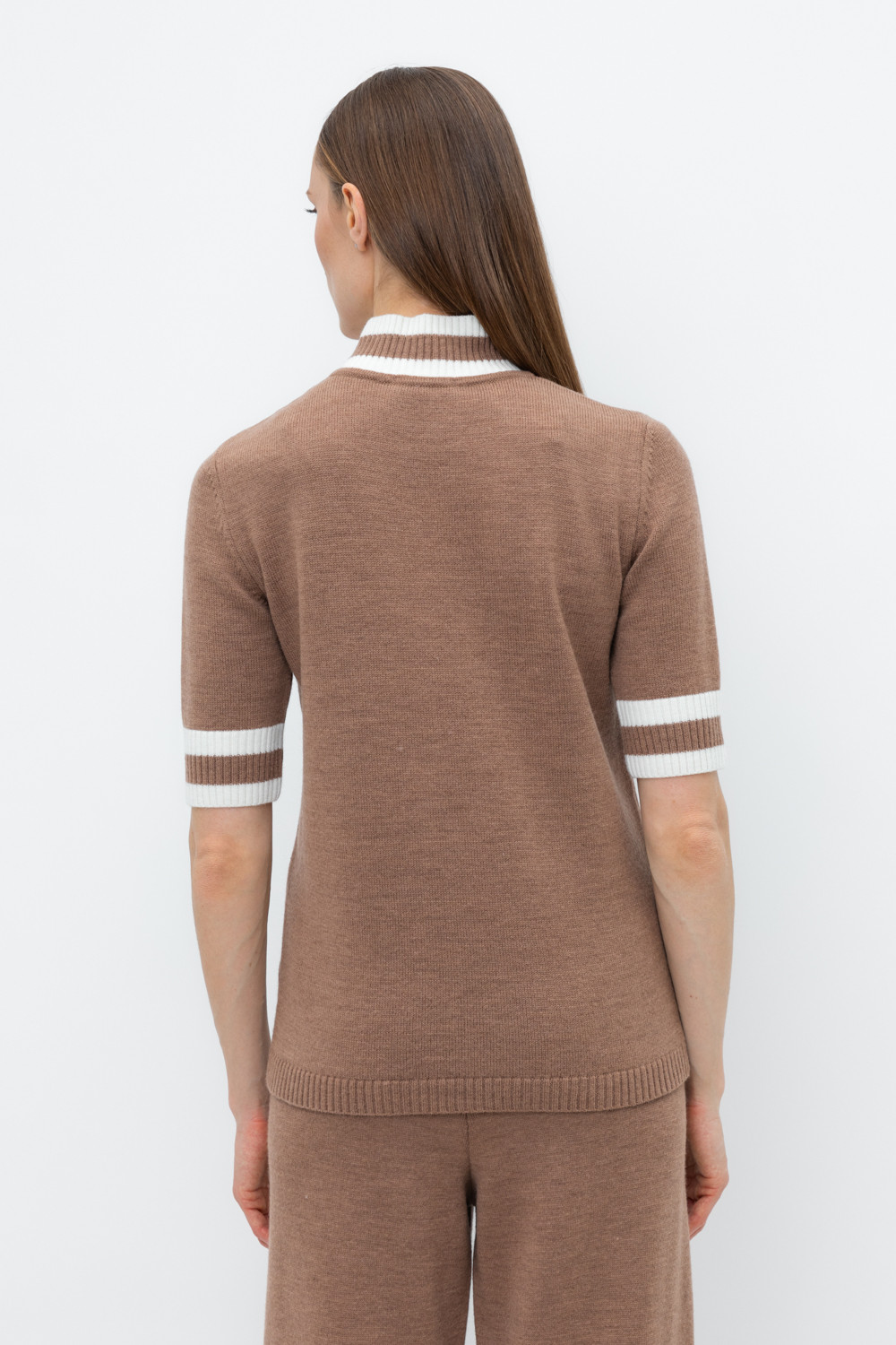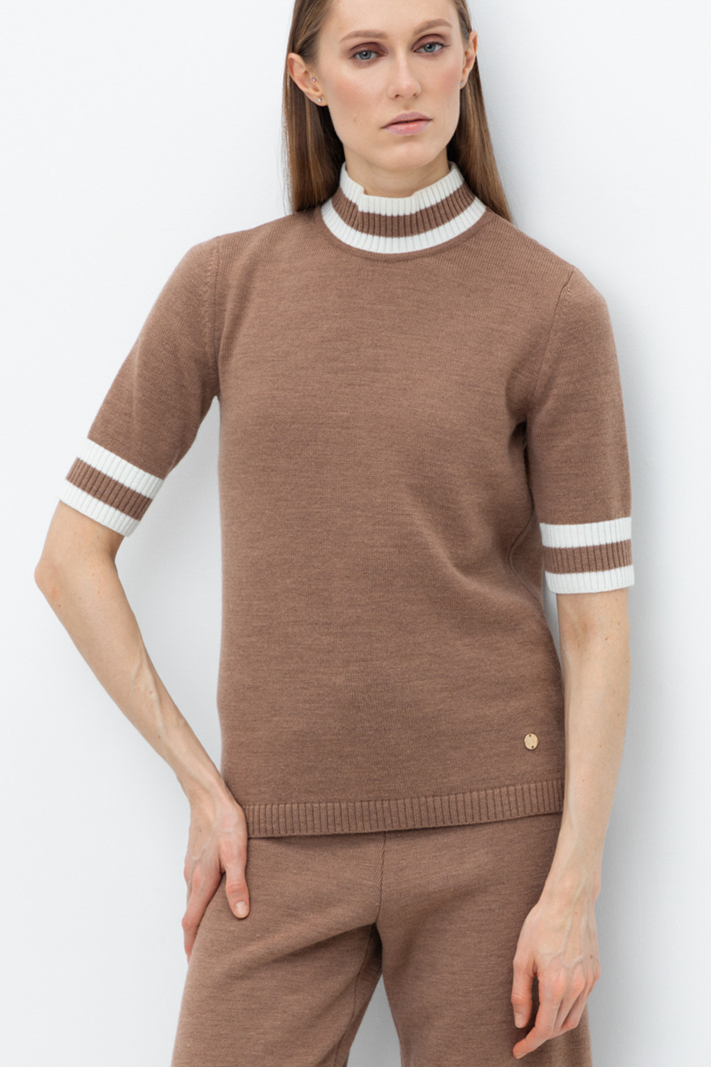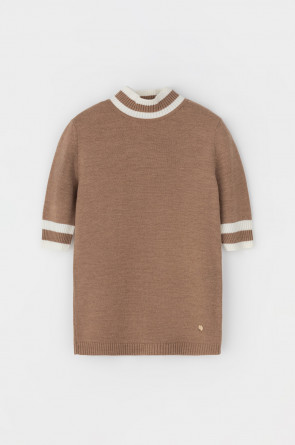 Джемпер в стиле прямой футболки, воротником-стойкой и короткими рукавами. Прямой силуэт, стандартная длина. Средняя плотность вязания, пластичная фактура. Выполнен гладью из мягкой полушерстяной пряжи. Шерсть в составе сохраняет тепло, а благодаря волокнам акрила изделие мягкое и дольше сохраняет форму.