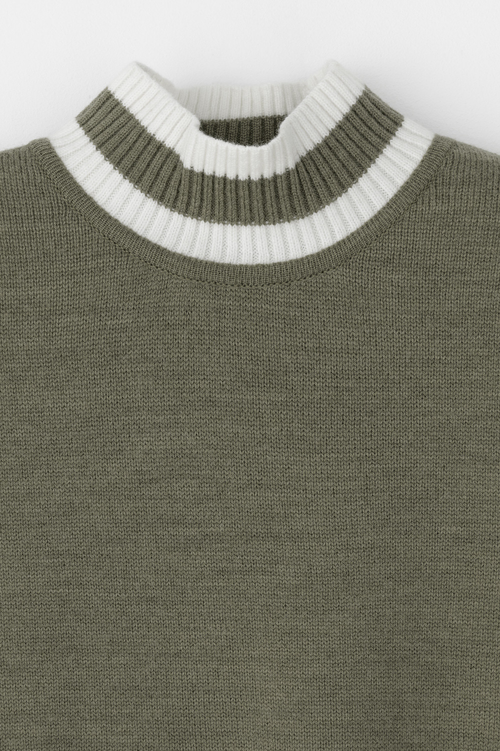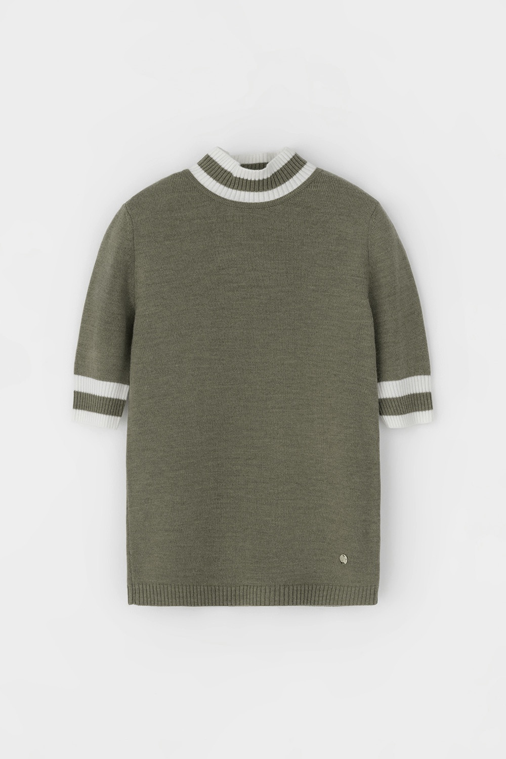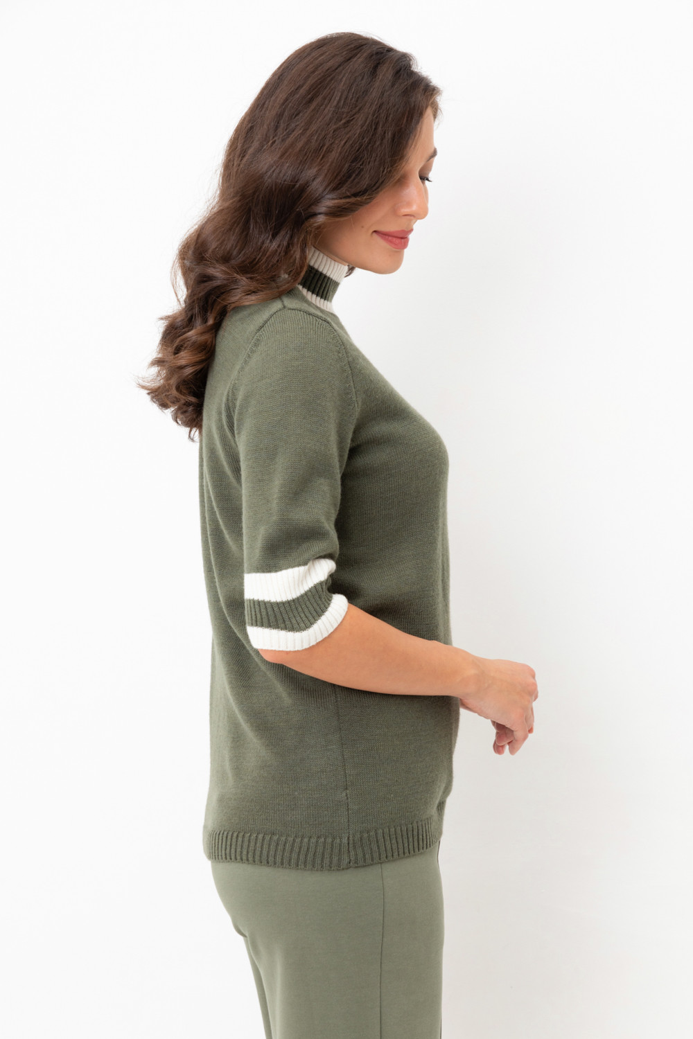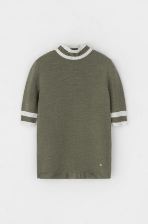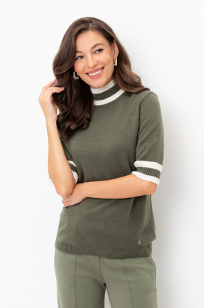 Джемпер в стиле прямой футболки, воротником-стойкой и короткими рукавами. Прямой силуэт, стандартная длина. Средняя плотность вязания, пластичная фактура. Выполнен гладью из мягкой полушерстяной пряжи. Шерсть в составе сохраняет тепло, а благодаря волокнам акрила изделие мягкое и дольше сохраняет форму.