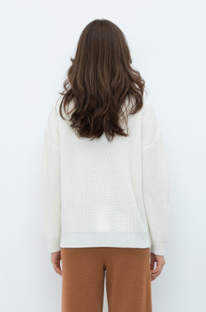 Уютный джемпер в стиле оверсайз со спущенным плечом и объемными рукавами из полушерстяной пряжи. Воротник-стойка застёгивается на молнию.