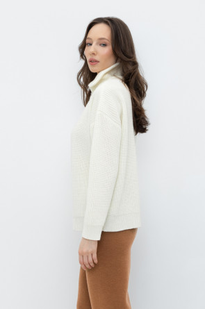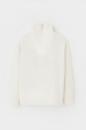 Уютный джемпер в стиле оверсайз со спущенным плечом и объемными рукавами из полушерстяной пряжи. Воротник-стойка застёгивается на молнию.