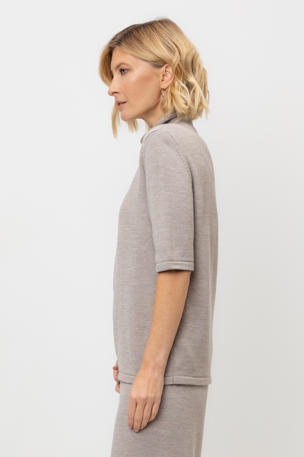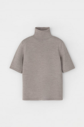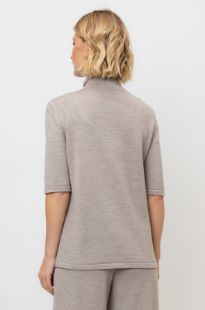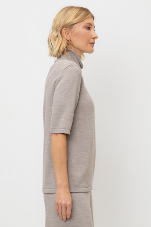Джемпер в стиле прямой футболки, воротником-стойкой и короткими рукавами. Прямой силуэт, стандартная длина. Средняя плотность вязания, пластичная фактура. Выполнен гладью из мягкой полушерстяной пряжи. Шерсть в составе сохраняет тепло, а благодаря волокнам акрила изделие мягкое и дольше сохраняет форму.