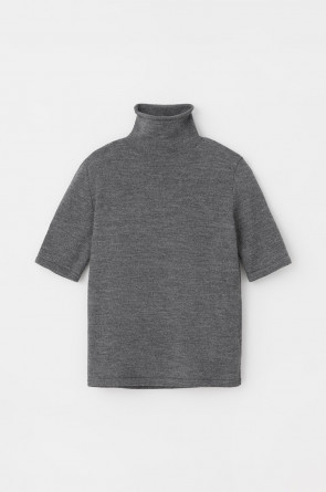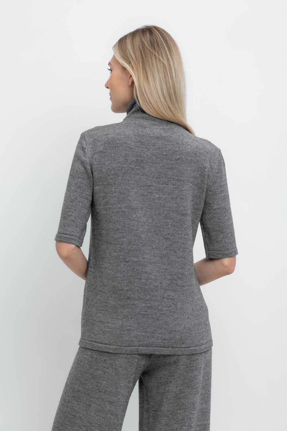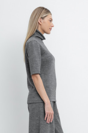 Джемпер в стиле прямой футболки, воротником-стойкой и короткими рукавами. Прямой силуэт, стандартная длина. Средняя плотность вязания, пластичная фактура. Выполнен гладью из мягкой полушерстяной пряжи. Шерсть в составе сохраняет тепло, а благодаря волокнам акрила изделие мягкое и дольше сохраняет форму.