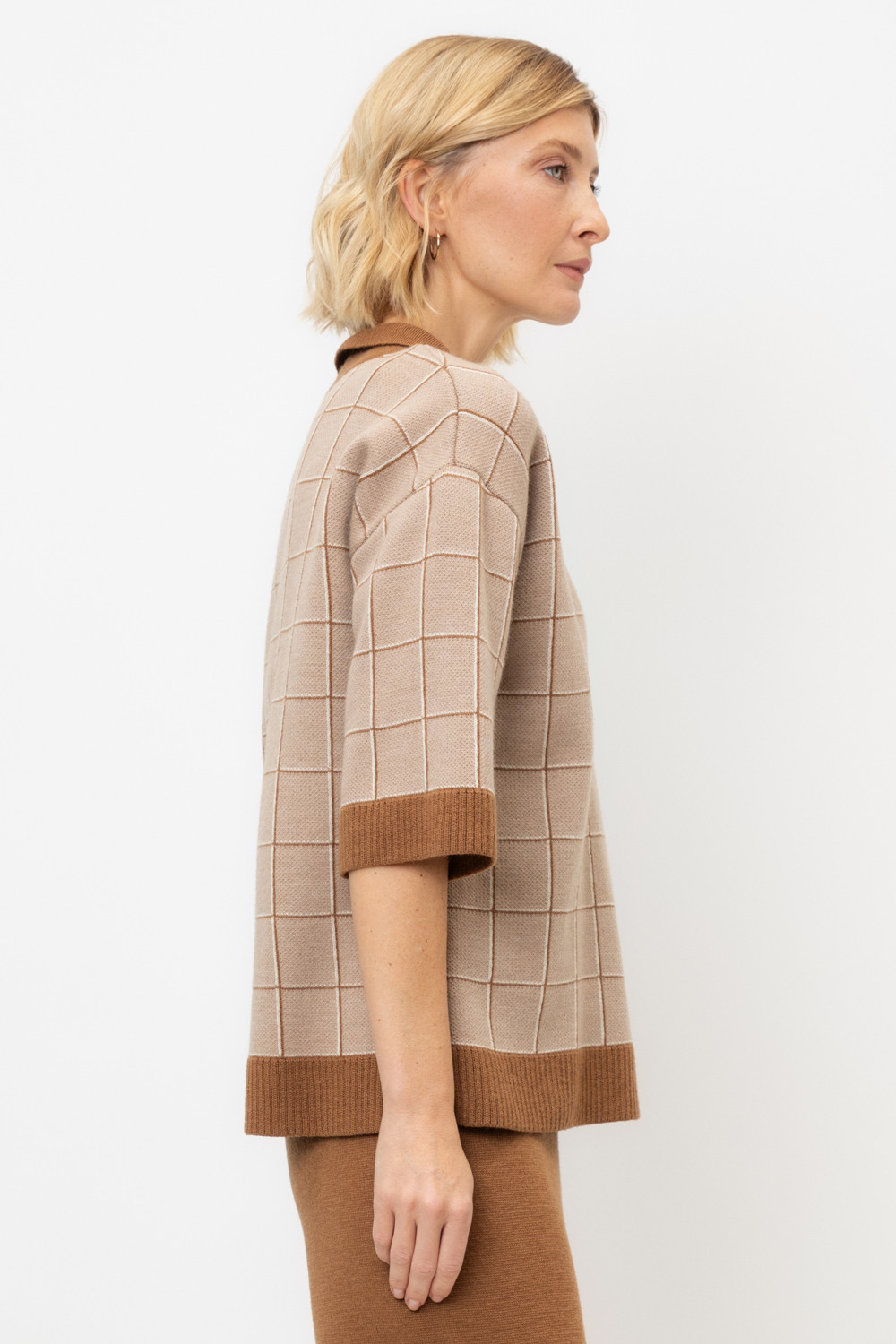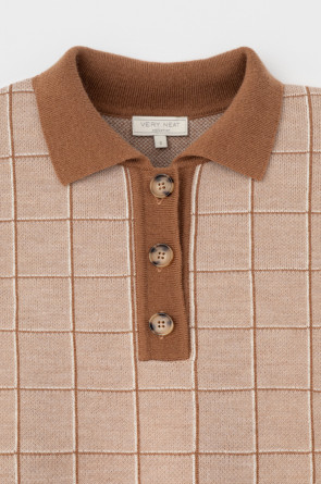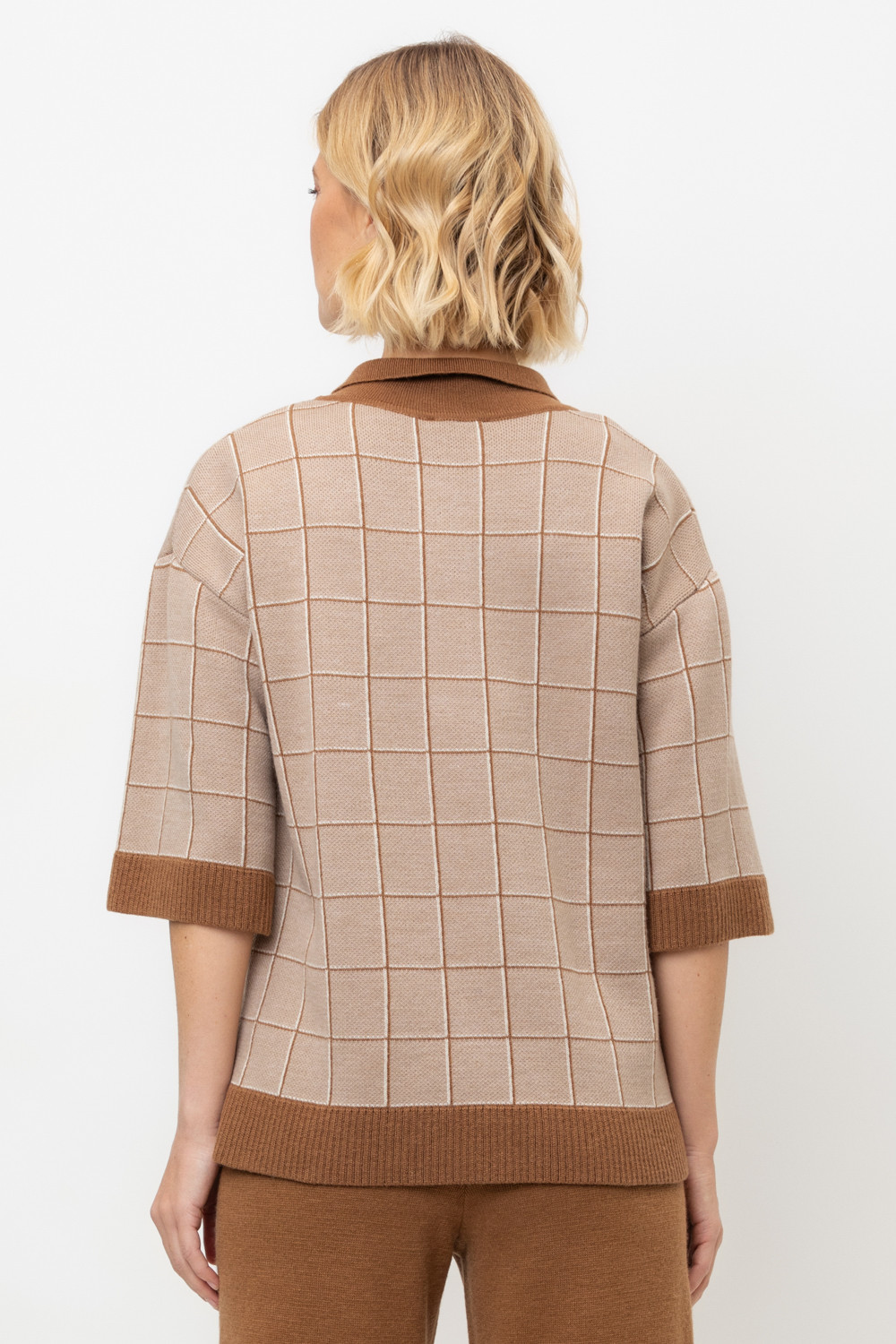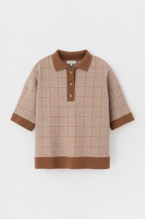 Поло свободного силуэта с короткими рукавами из полушерстяной пряжи. Связано жаккардом, манжеты и низ изделия хорошо держат форму благодаря вывязанной резинке. Спущенное плечо и прямой силуэт придают изделию свободный объем.
