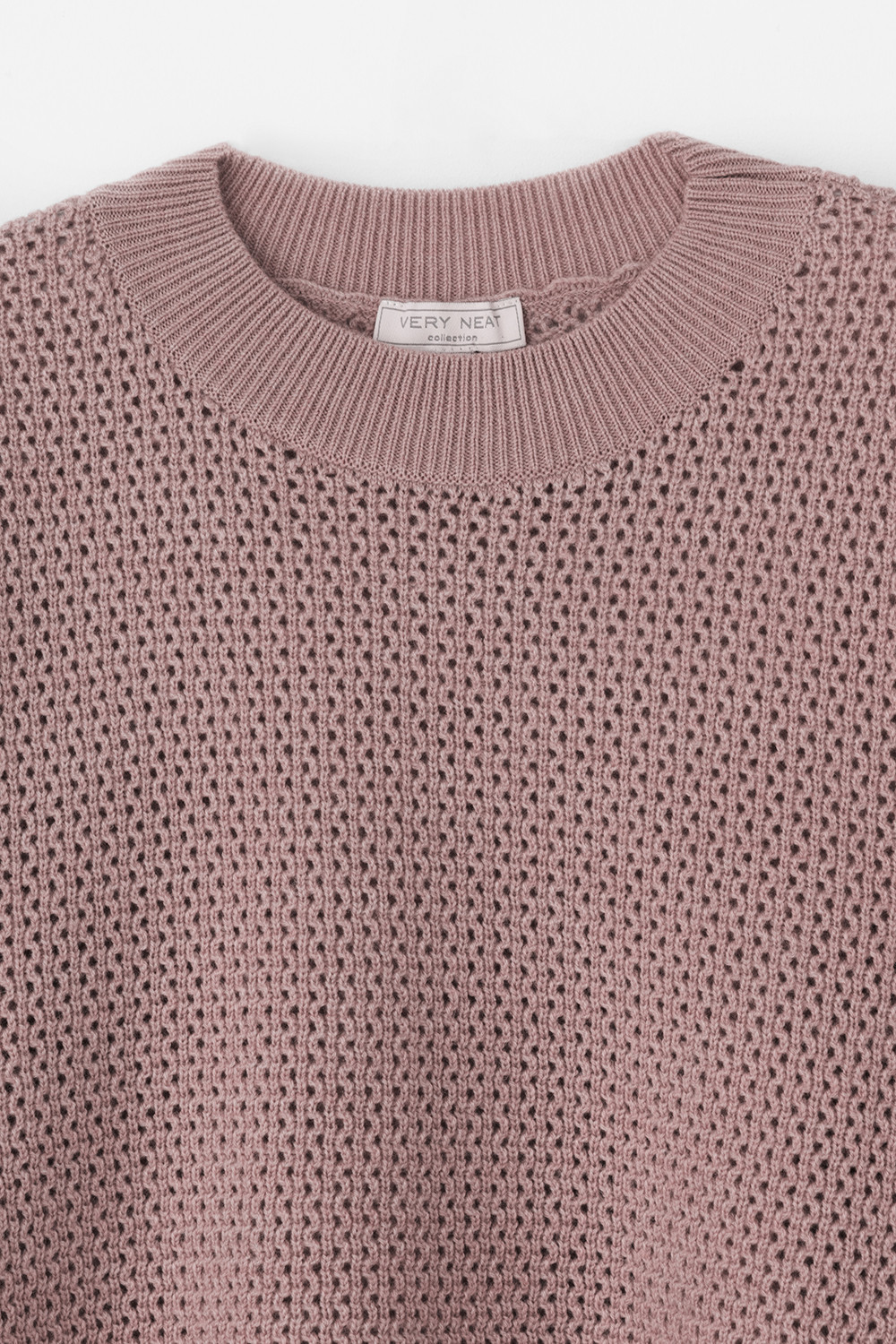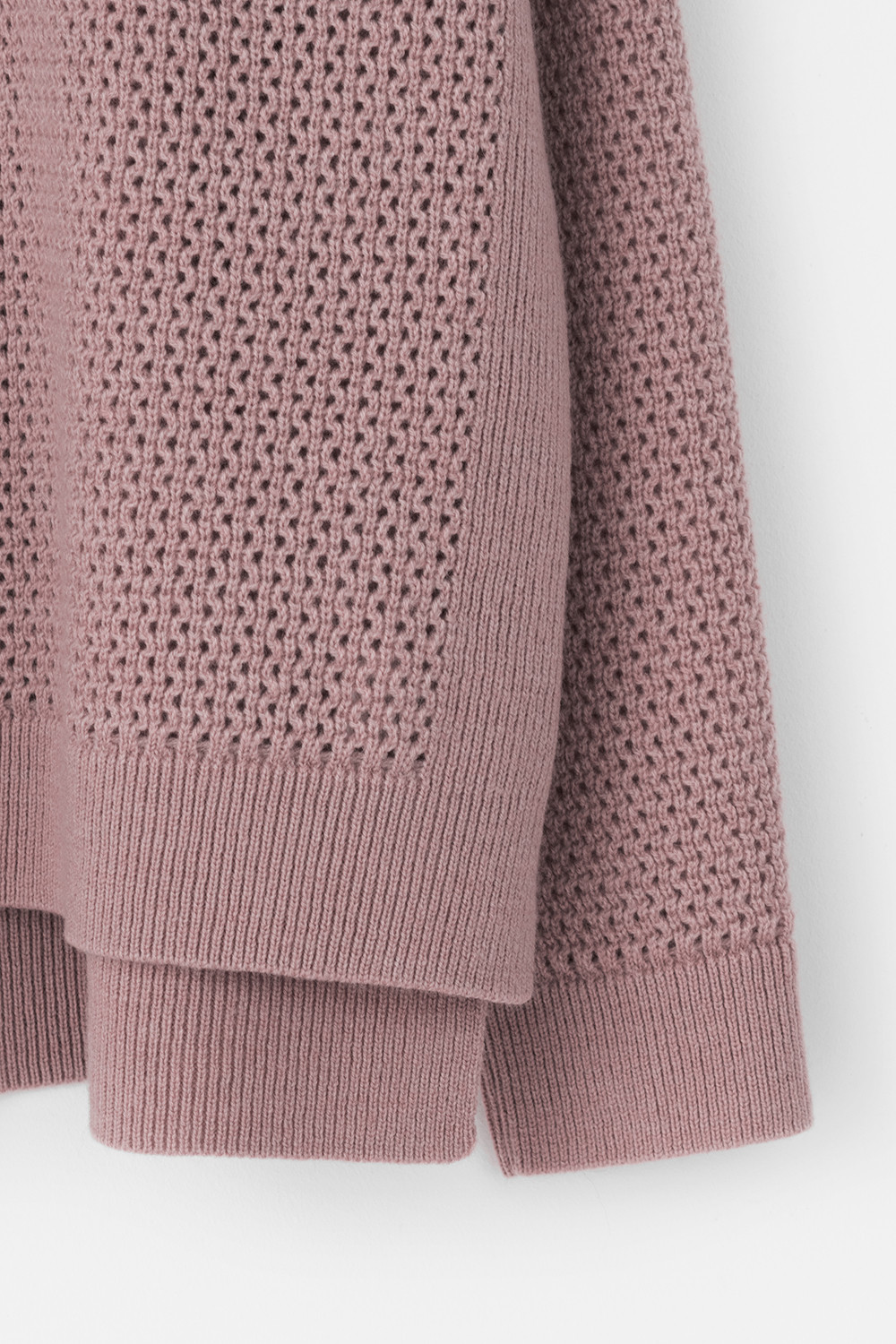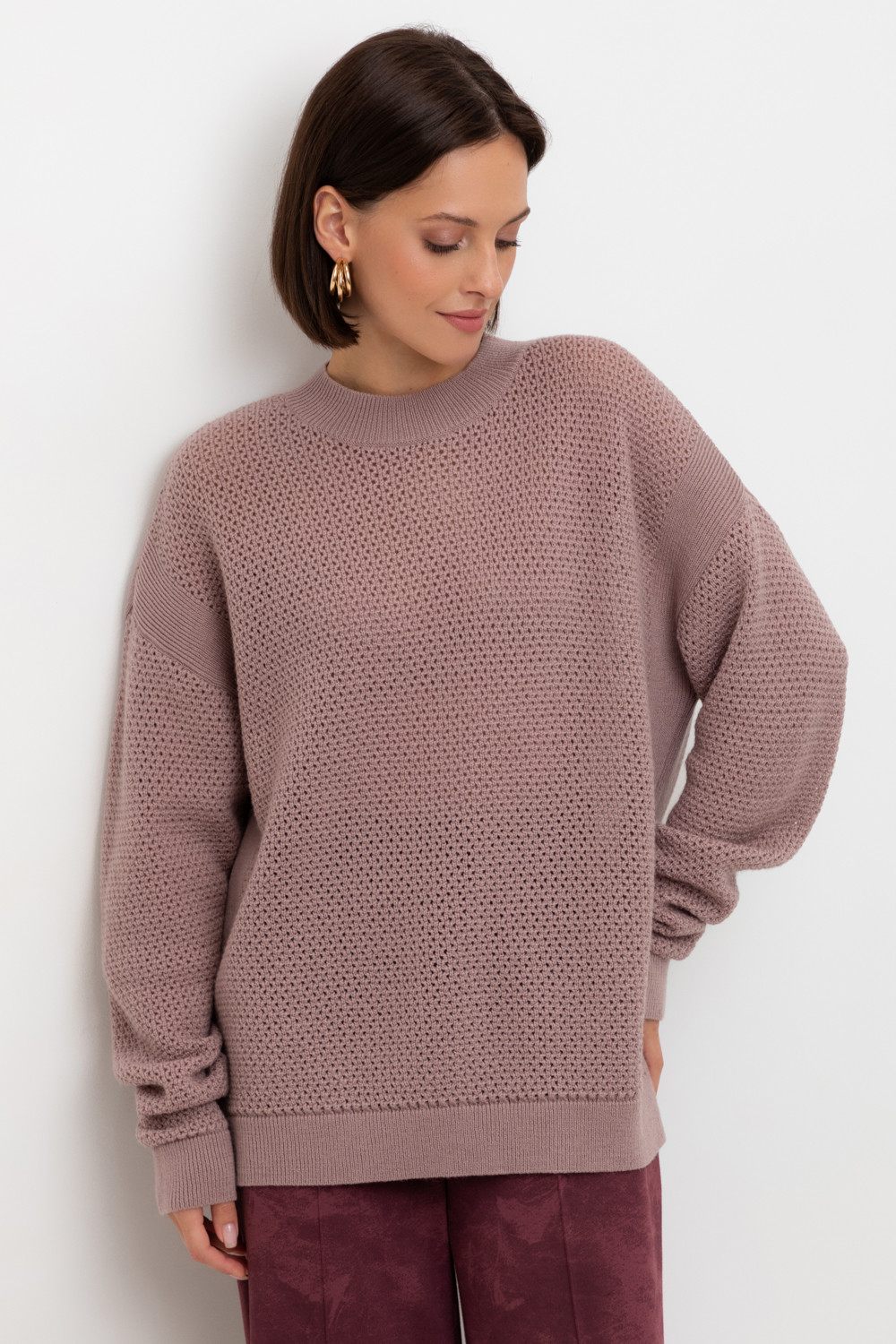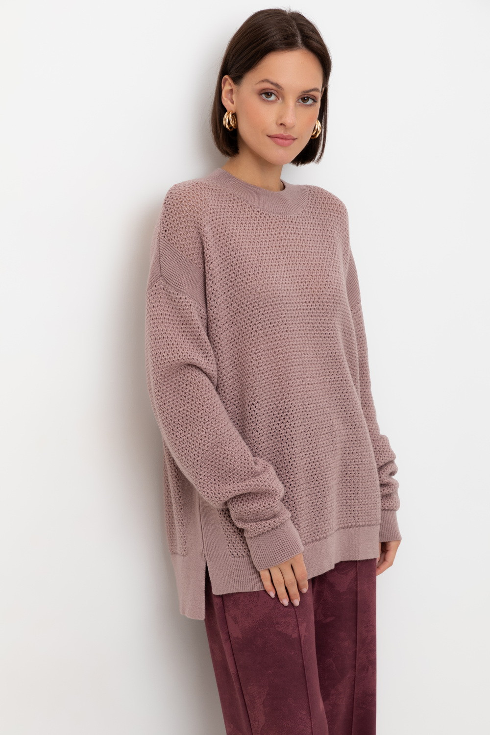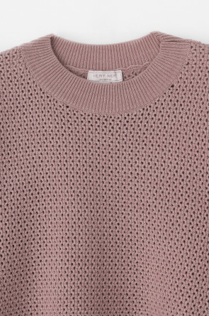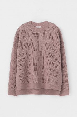 Джемпер с удлиненной спинкой и разрезами по бокам связан ажурной вязкой "волна". Средняя плотность вязания и пластичная фактура сохраняют форму изделия.