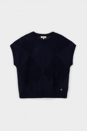 Джемпер со спущенным плечом ажурной вязки из итальянского хлопка. Умеренное переплетение, хлопок в составе придают изделию форму и ощущение комфорта во время носки. Незаменим в повседневном летнем гардеробе.