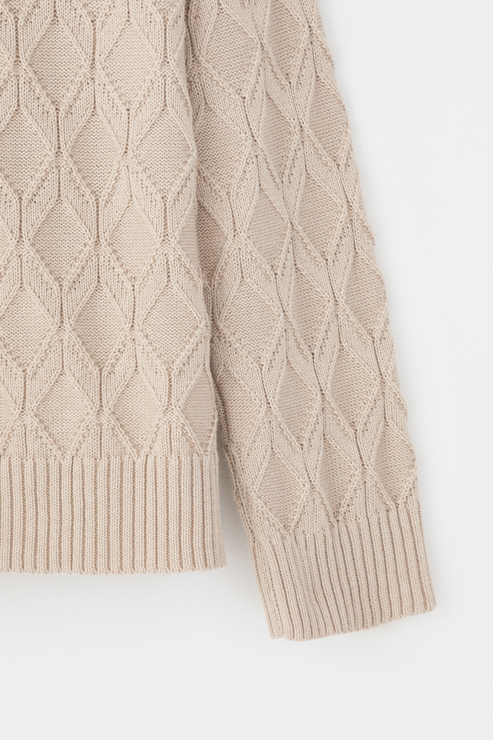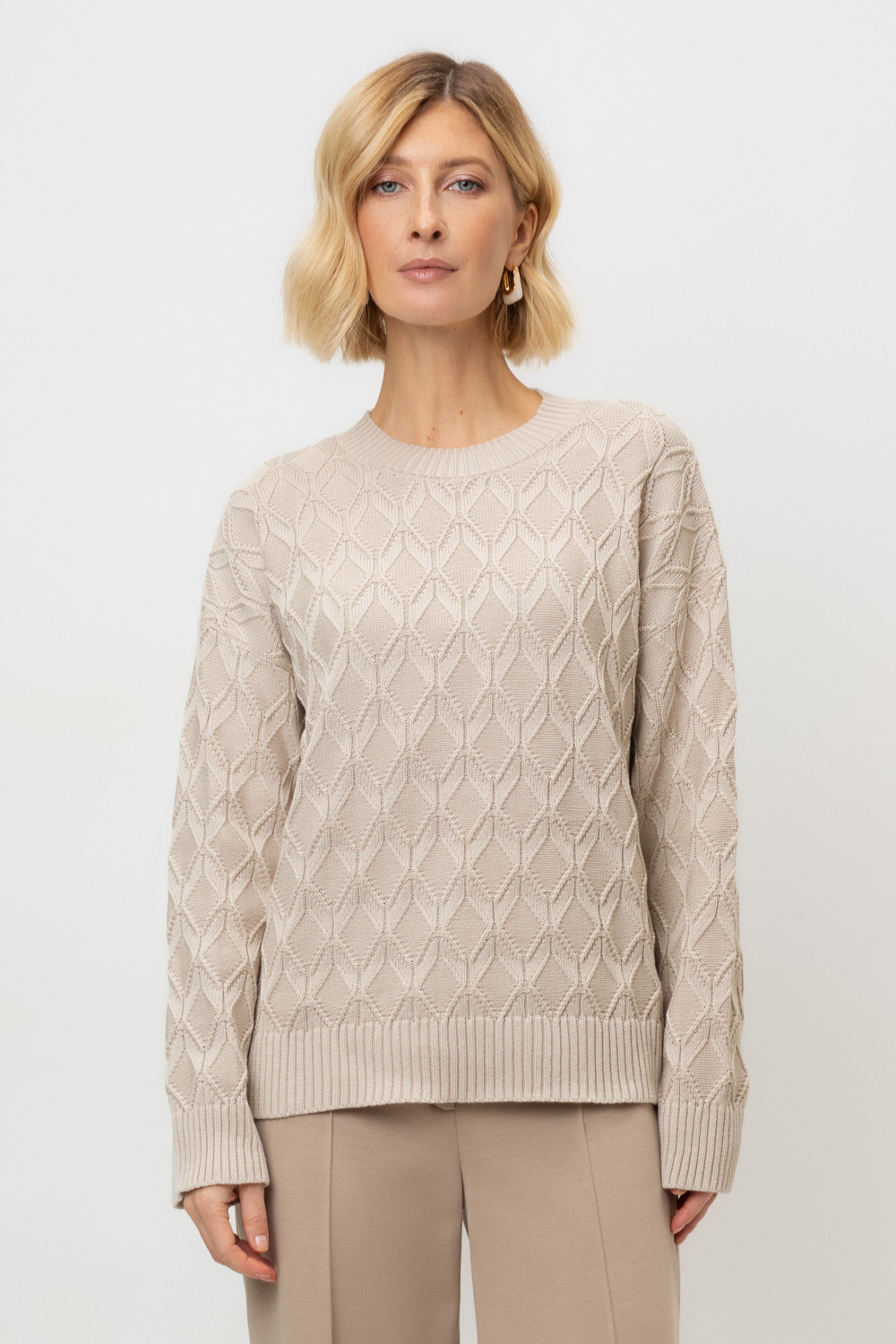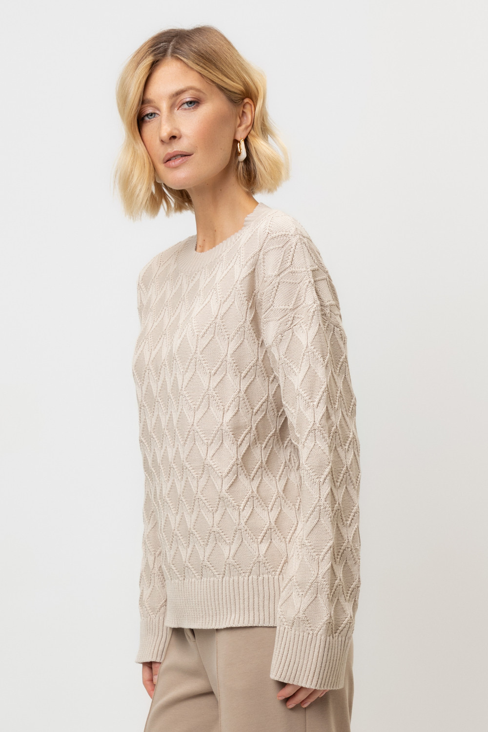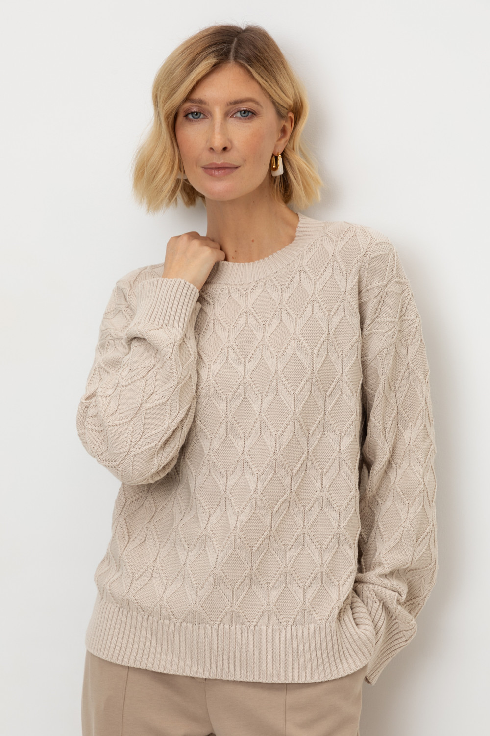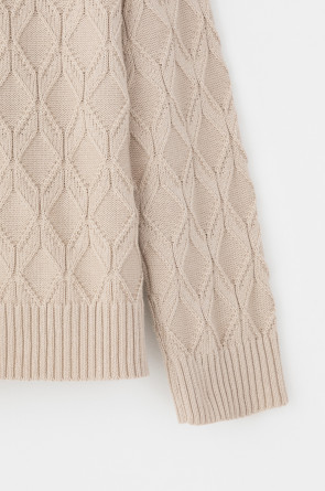 Вязаный джемпер из хлопковой пряжи. Вязаный хлопок сохраняет тепло, а волокна акрила добавляют мягкость. Спущенные рукава придают объем.