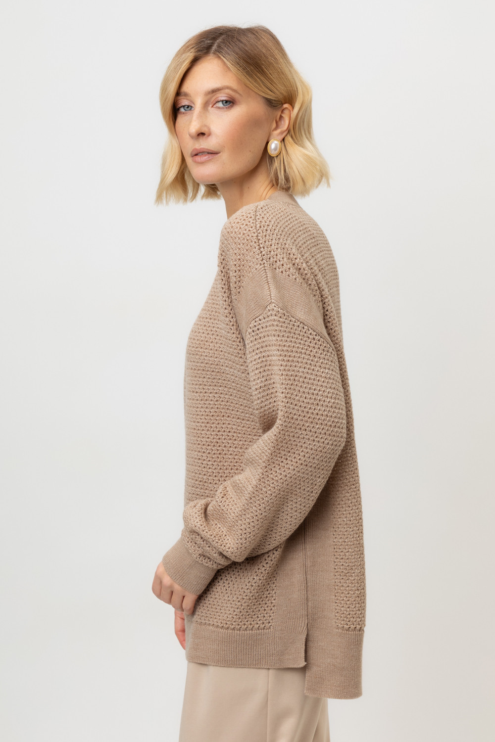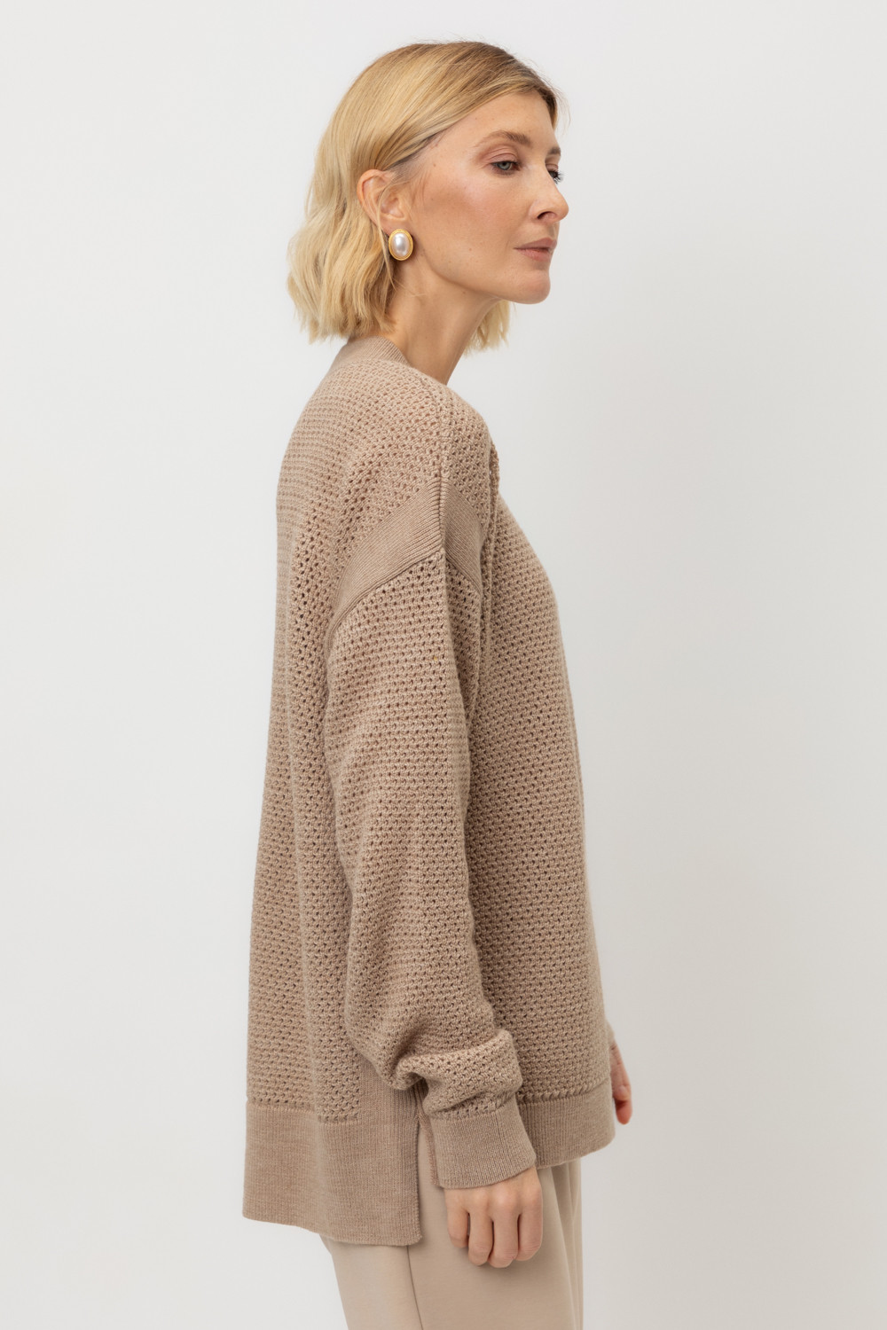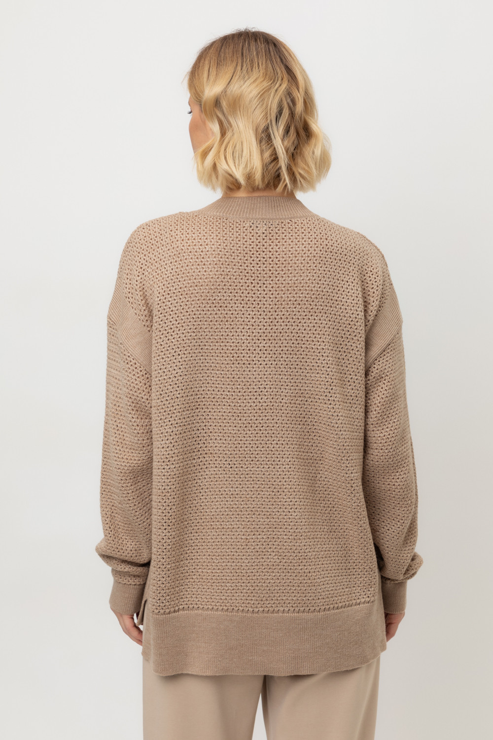 Выполнен из мягкой полушерстяной пряжи. Шерсть в составе сохраняет тепло, акрил делает изделие мягким. Прямой силуэт идеально подходит как к юбке, так и к брюкам.