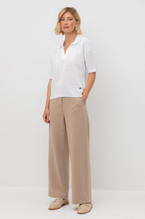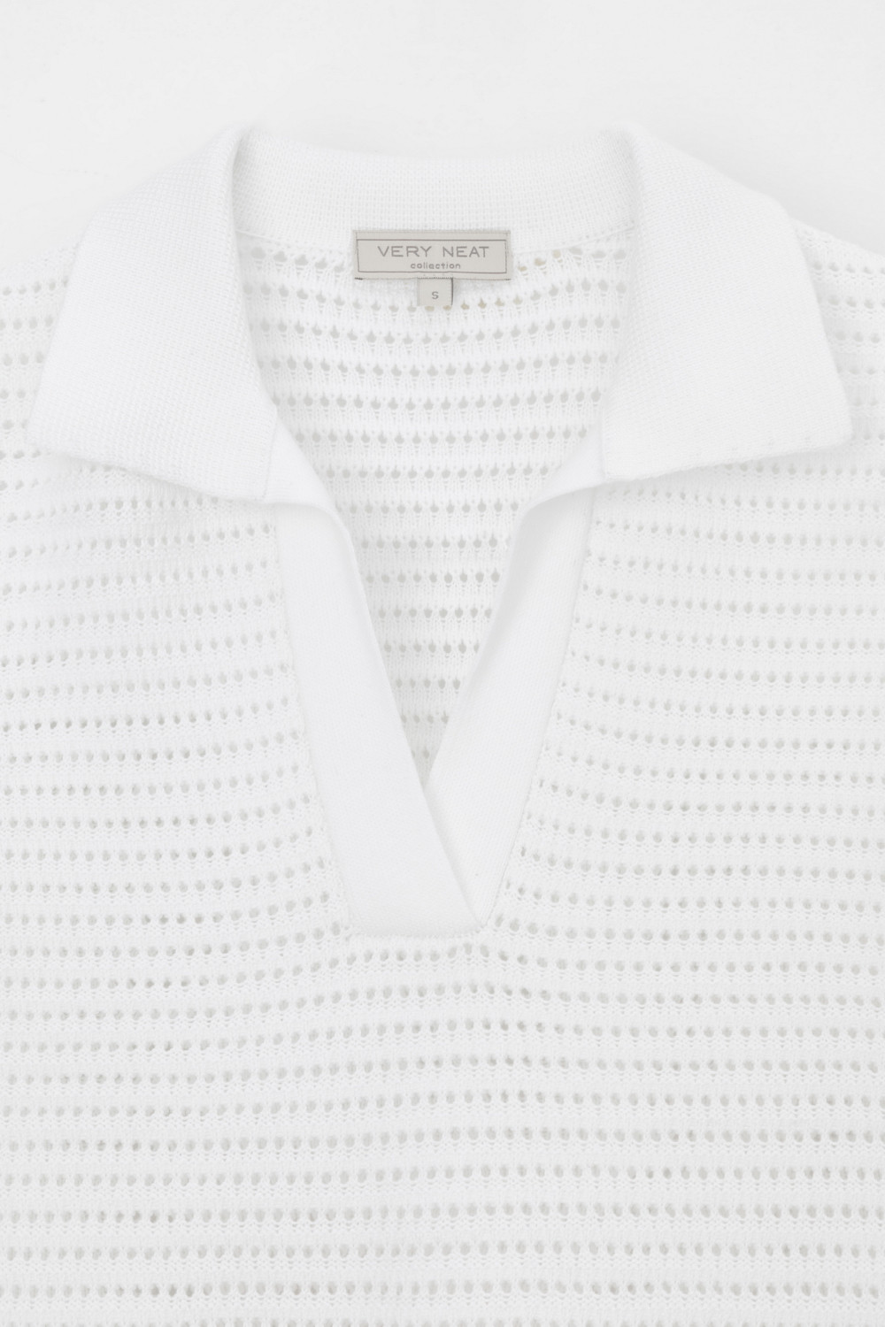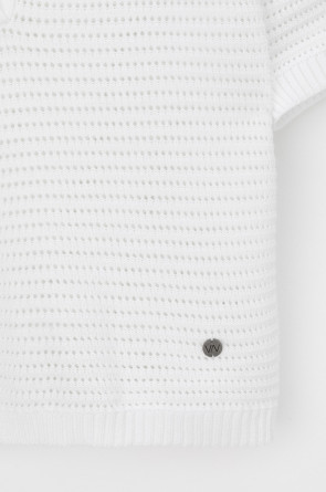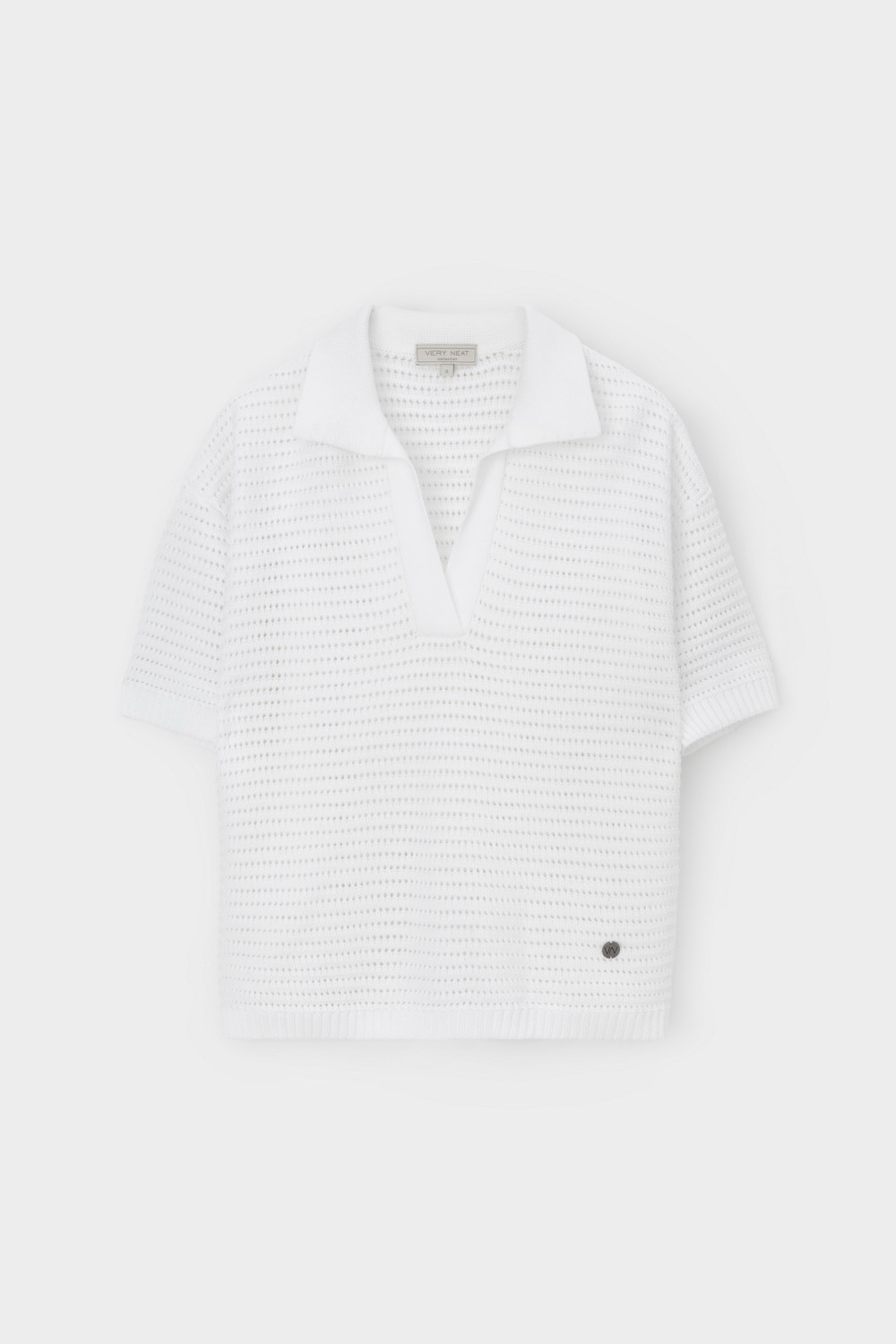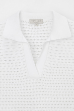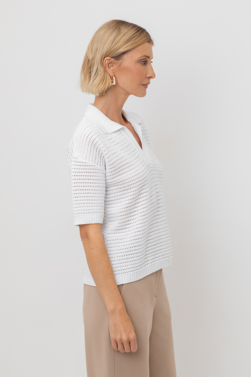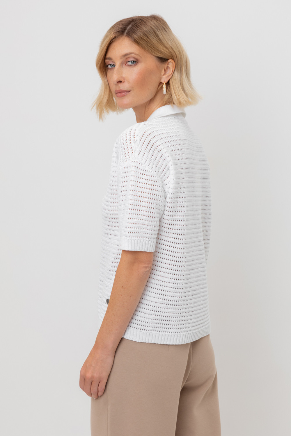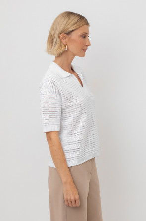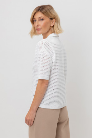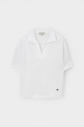 Воздушное поло ажурной вязки из итальянского хлопка. Мягкий воротник без застежки в стиле поло и спущенная линия плеча добавляет легкости при создании летних образов.