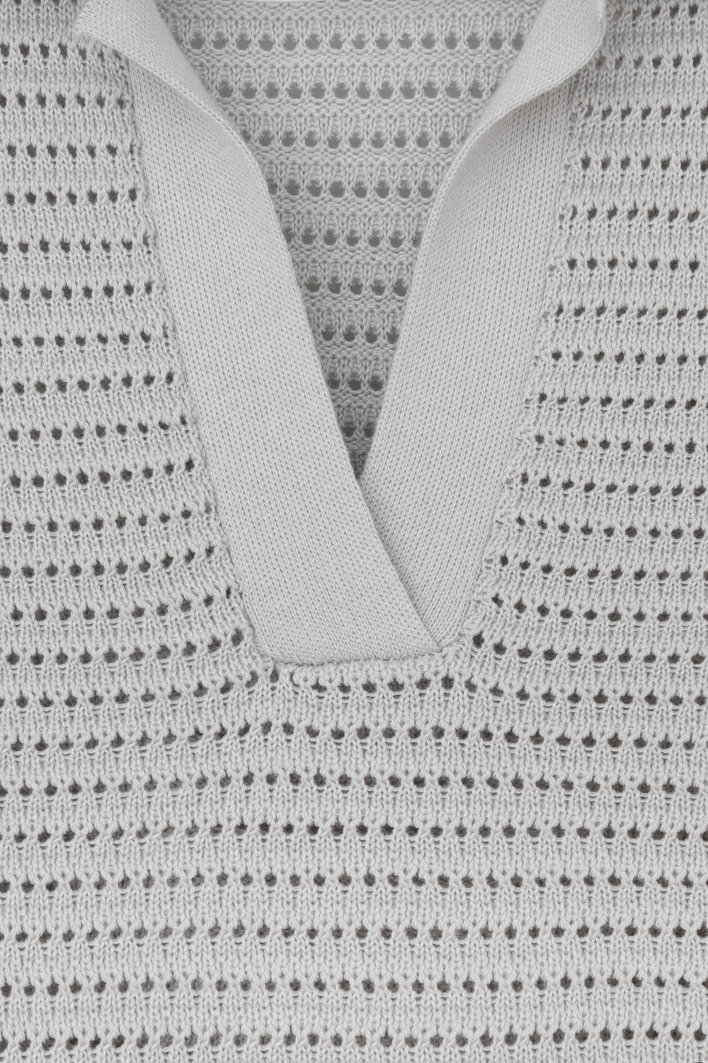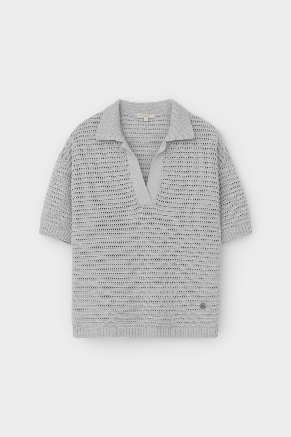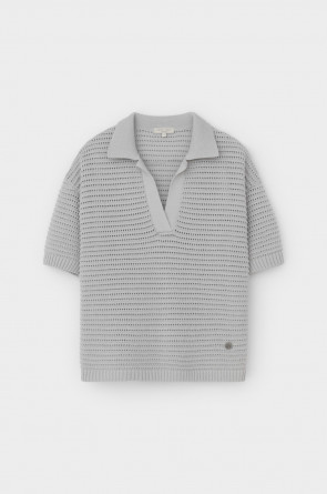 Воздушное поло ажурной вязки из итальянского хлопка. Мягкий воротник без застежки в стиле поло и спущенная линия плеча добавляет легкости при создании летних образов.