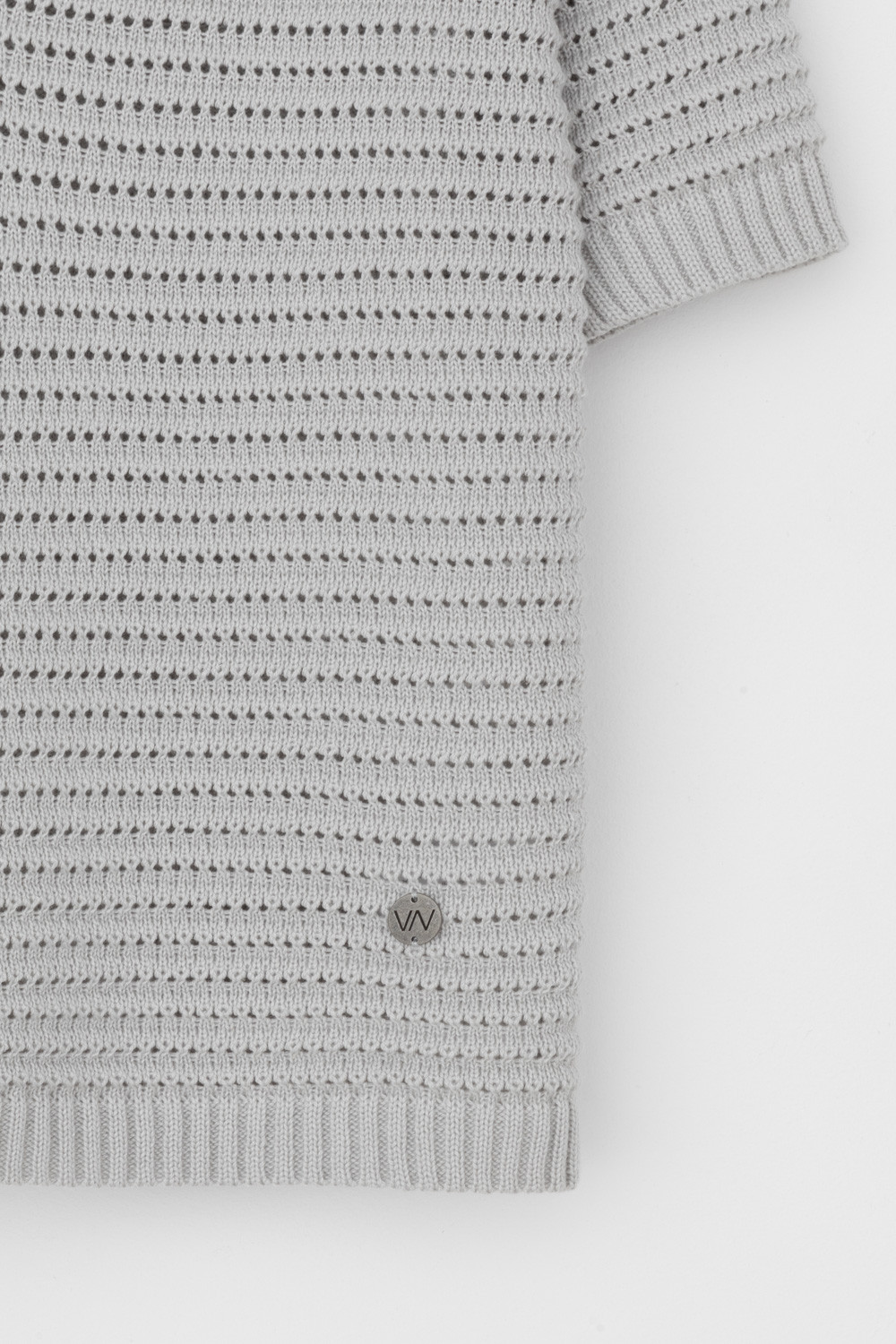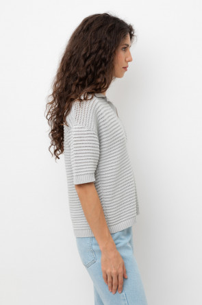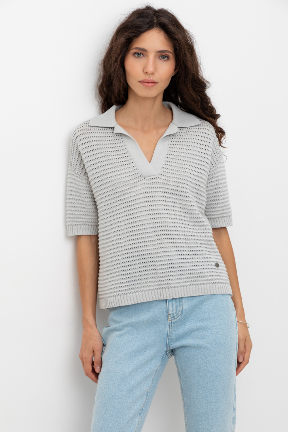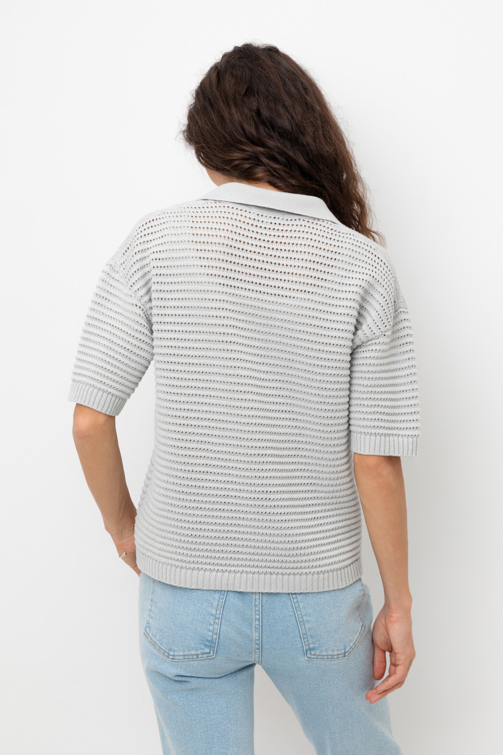 Воздушное поло ажурной вязки из итальянского хлопка. Мягкий воротник без застежки в стиле поло и спущенная линия плеча добавляет легкости при создании летних образов.