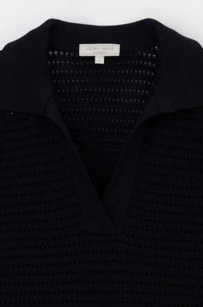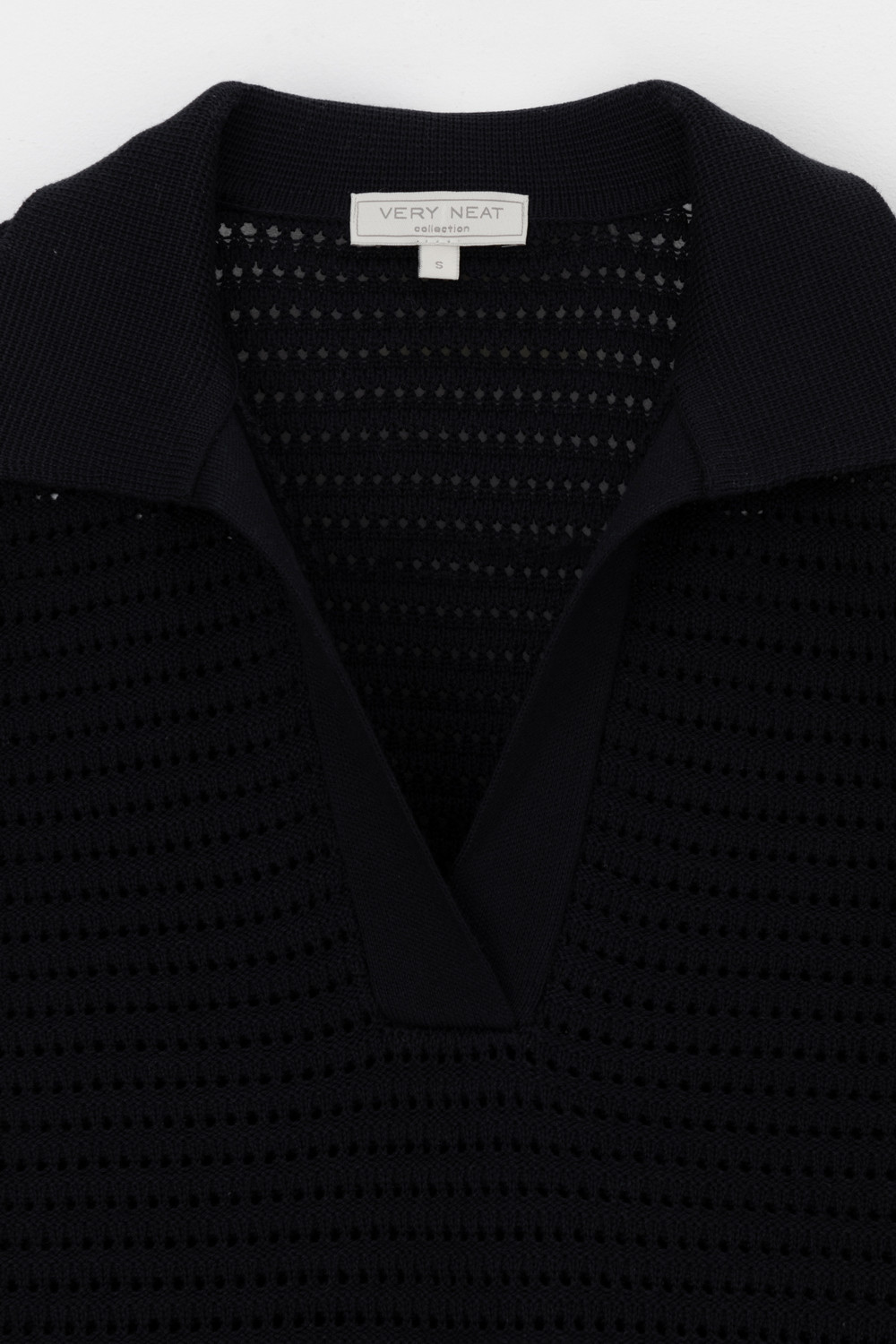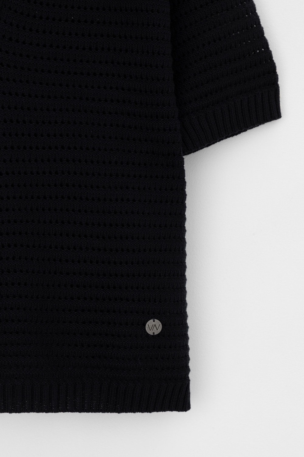 Воздушное поло ажурной вязки из итальянского хлопка. Мягкий воротник без застежки в стиле поло и спущенная линия плеча добавляет легкости при создании летних образов.