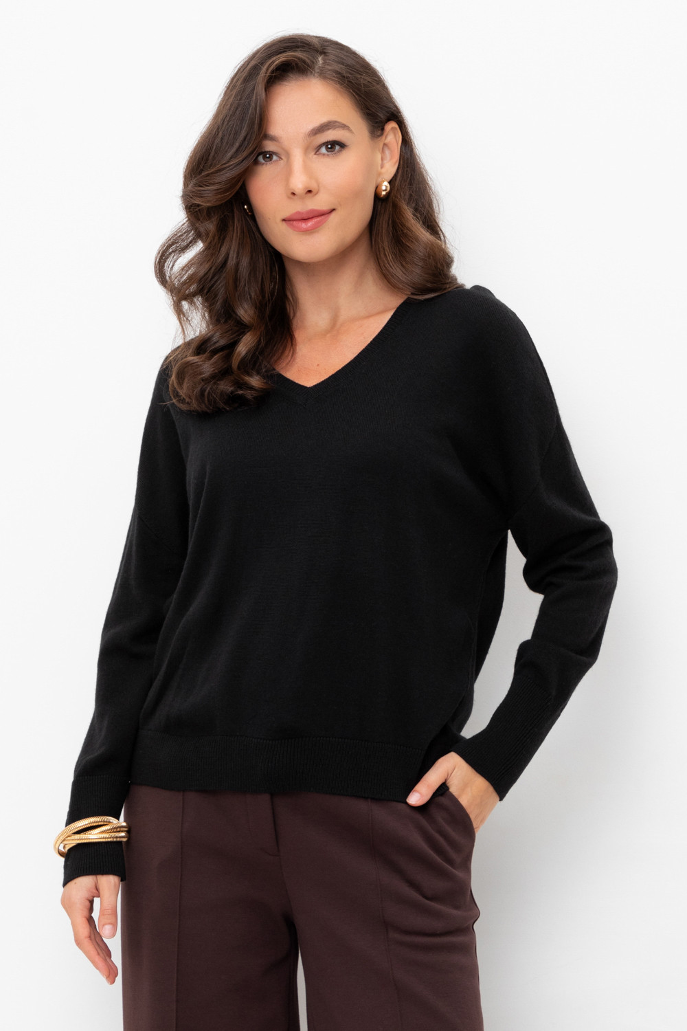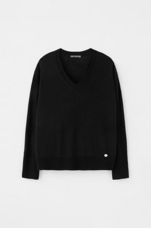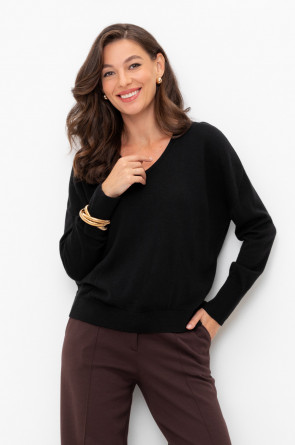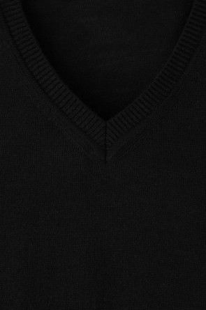 Уютный джемпер с V-образным вырезом. Выполнен гладью, манжеты, воротник и низ изделия связаны ластиком. В составе полушерстяная пряжа. Шерсть в составе приятно согревает, а благодаря волокнам акрила изделие мягкое и дольше сохраняет форму.
