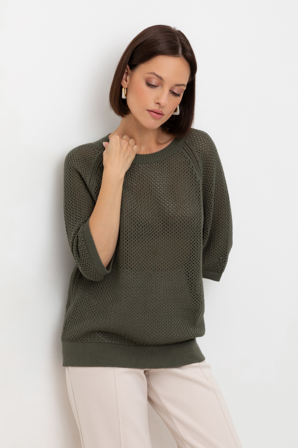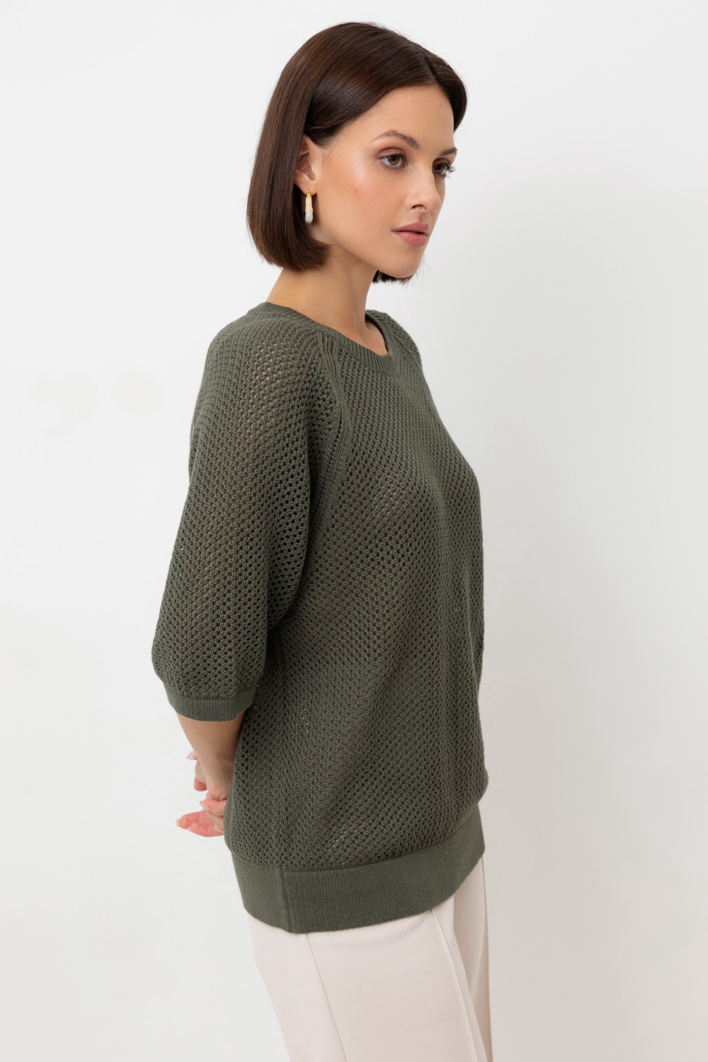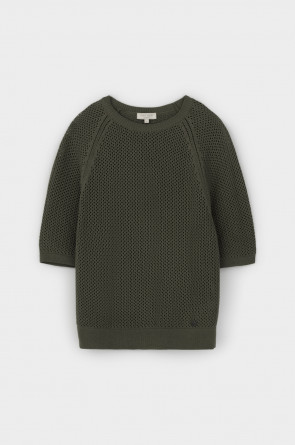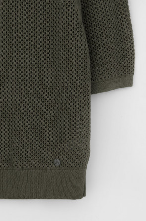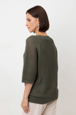 Джемпер свободного кроя ажурной вязки из итальянского хлопка. Умеренное переплетение, хлопок в составе, придают изделию форму и ощущение комфорта во время носки. Незаменим в повседневном летнем гардеробе.
